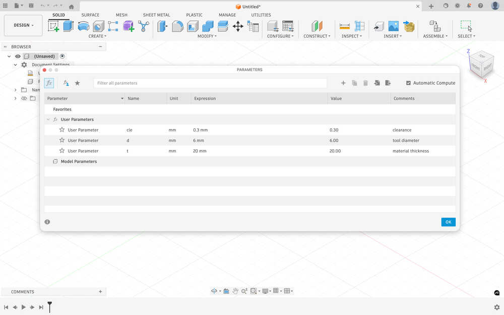 I created two parameters: clearance and tool diameter, which have the values 0.3mm and 6mm, respectively.