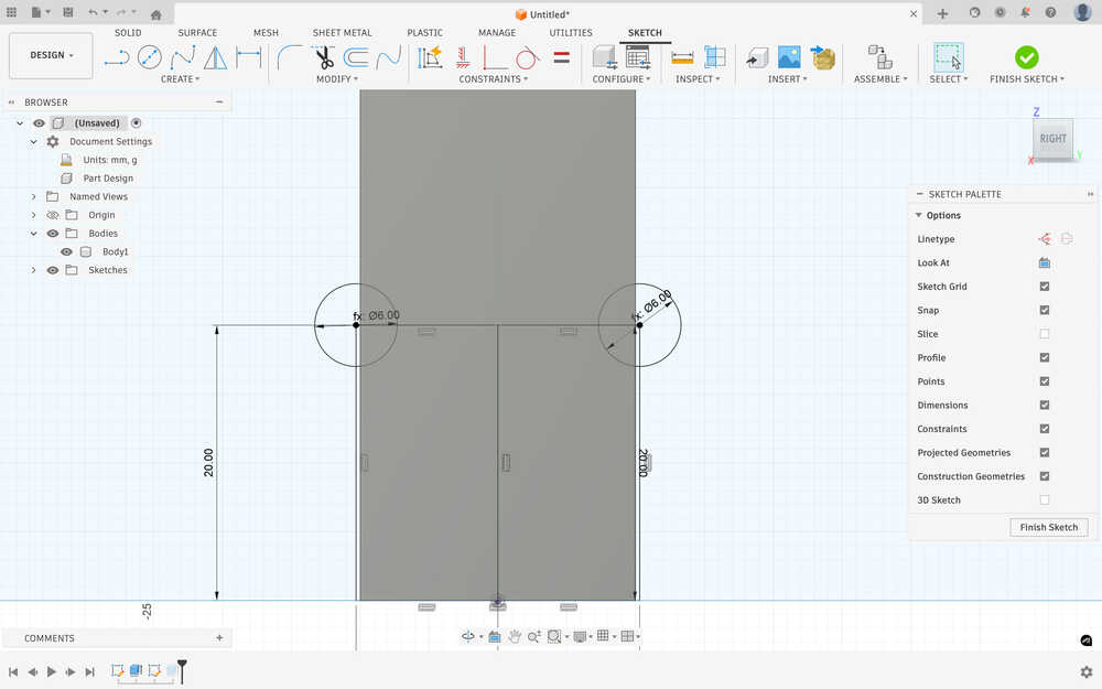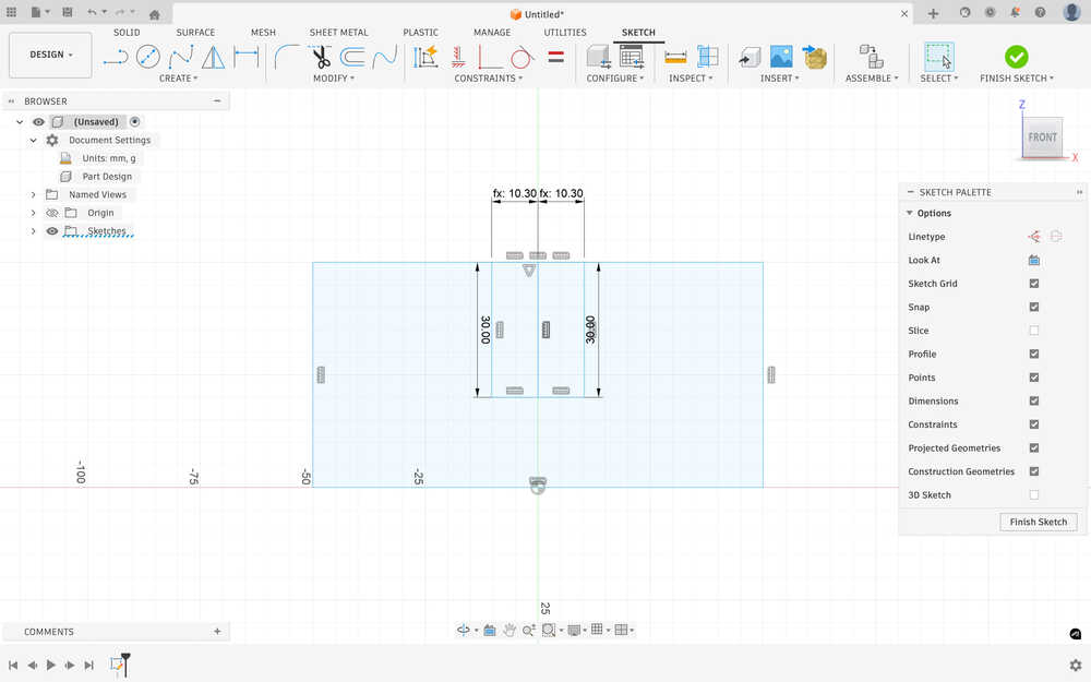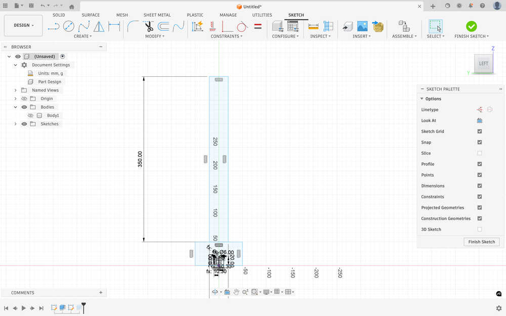 I sketched the first part of a leg. I want the stool to have plus shaped leg base. The middle has the equation material thickness / 2 + 2 * clearance.
