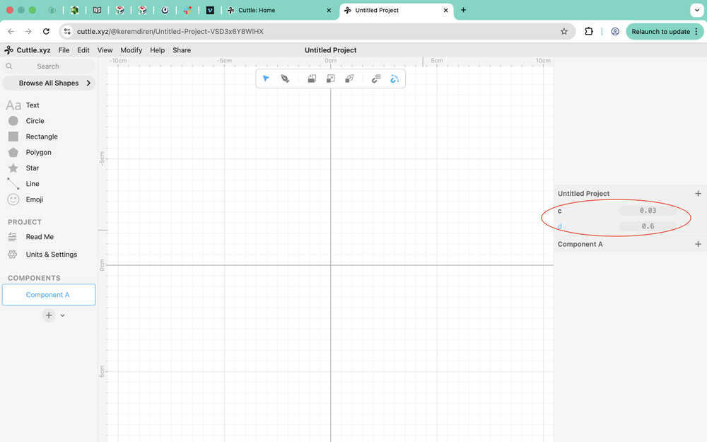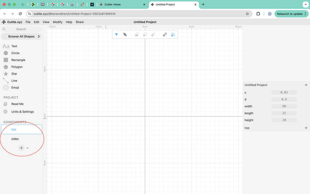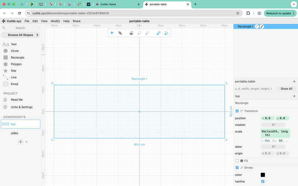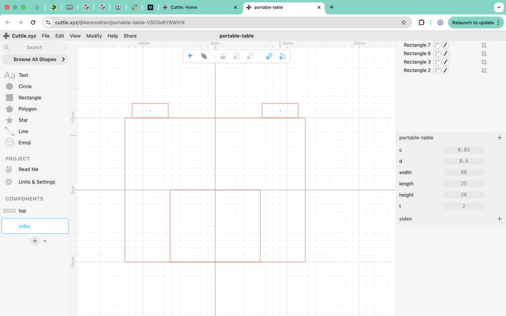 I created a rectangle to use as a connection part to the sides component. You can see the parameters I used at the right part of my screen. I made it so that the hole will always be 1cm away from the left and the top of the big rectangle.