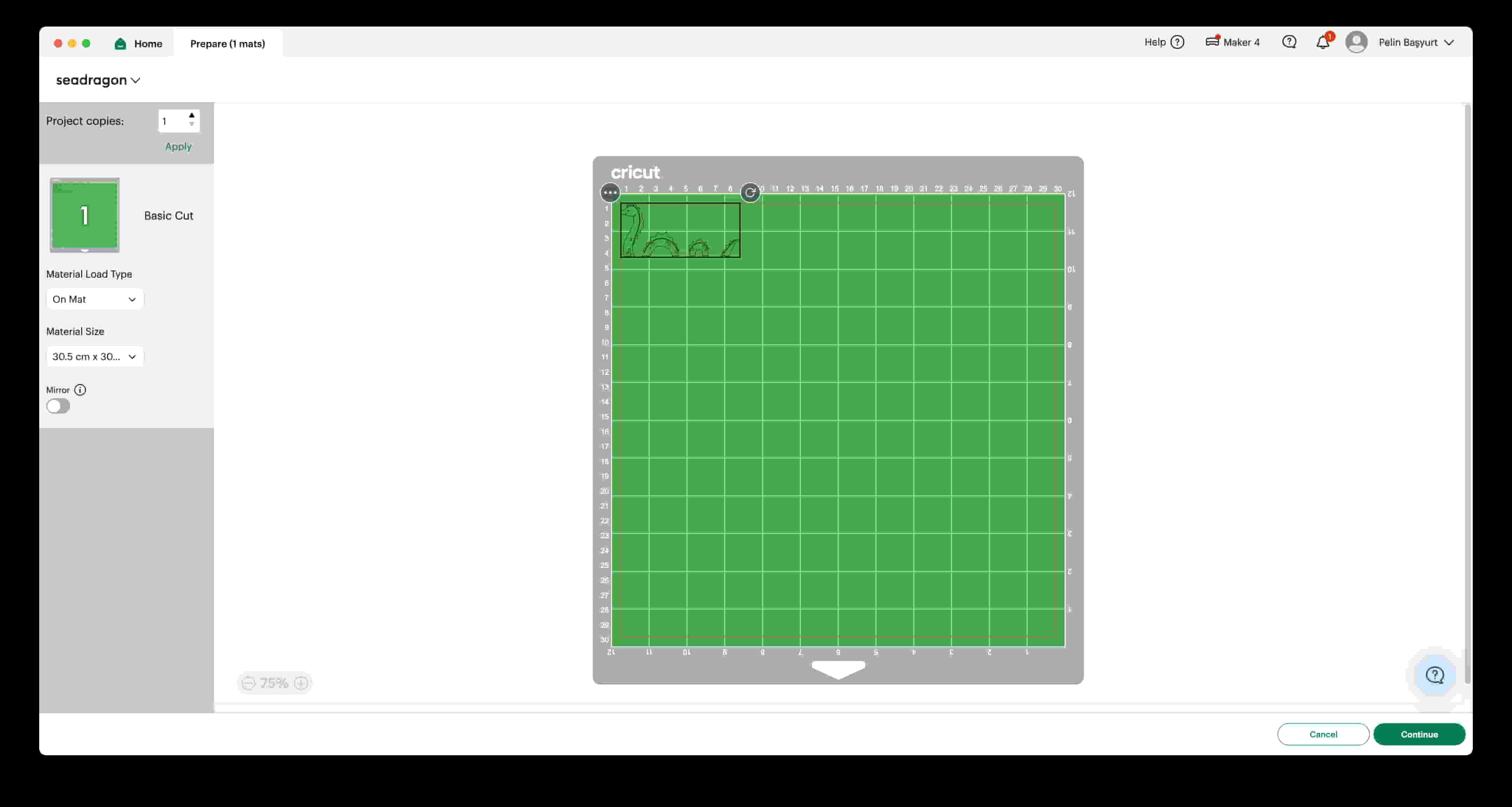 After choosing the correct mat size on the left, I adjusted the design on the mat and clicked on “Continue”.