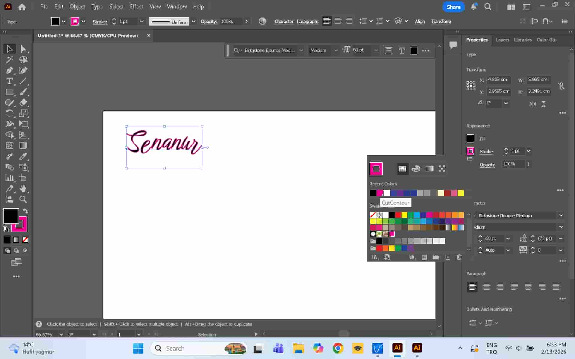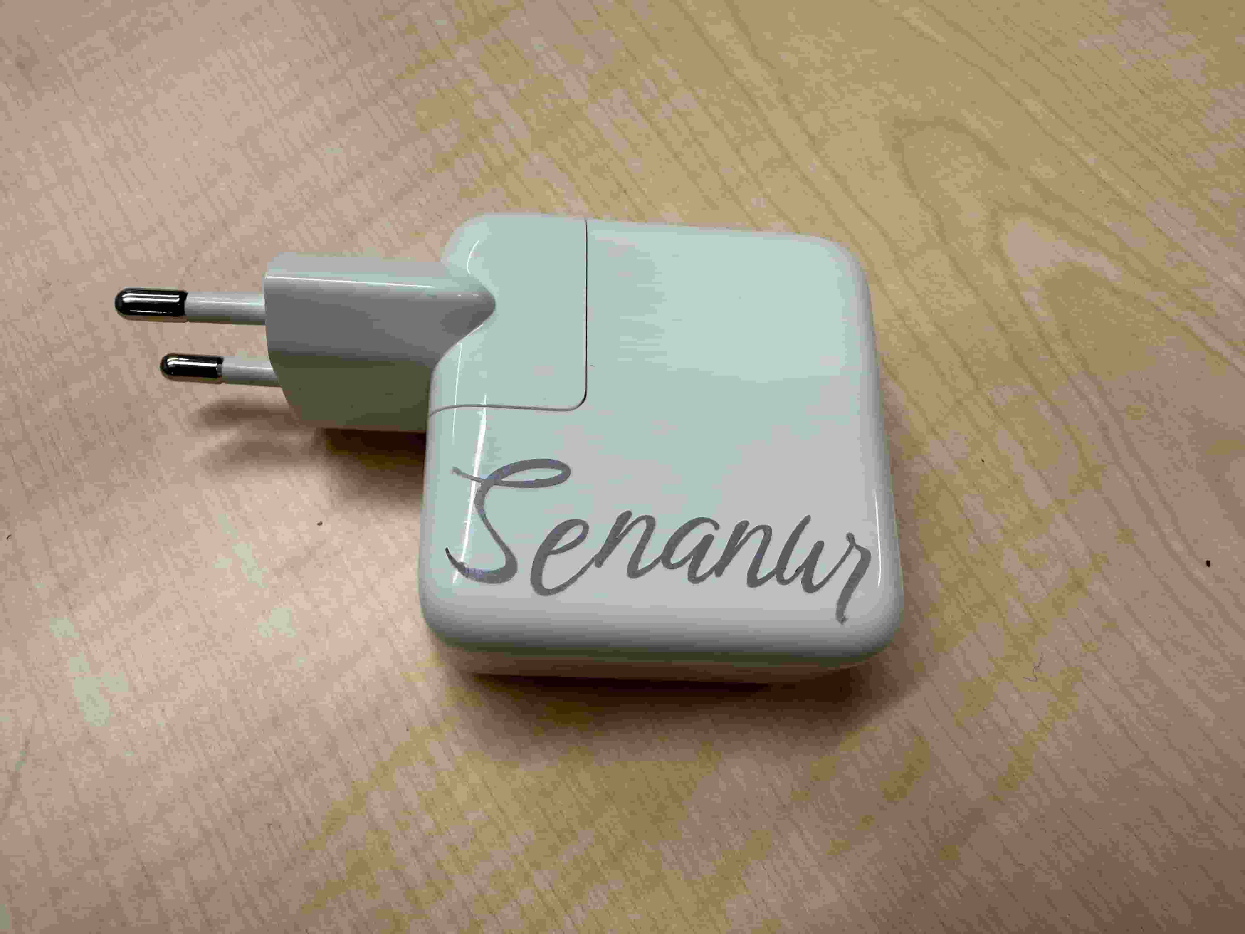 I spend all day at the lab and sometimes students borrow my charger. I decided to put my name on it so that I can find it if lost. So, I made a design with my name on it. I chose a font, then used the CutContour color as stroke color to designate the cutting routes. This is the color designated by Roland VersaWorks for cutting lines.