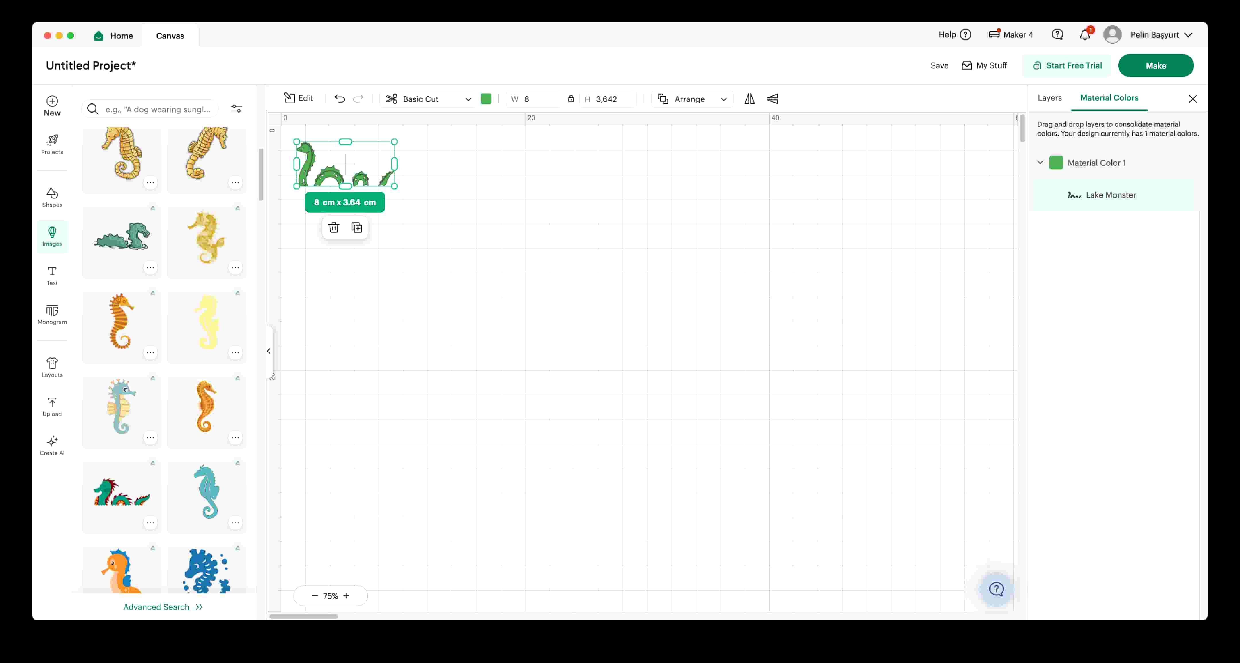 I liked the pre-designed sea dragon drawing and decided that I wanted it as a sticker :3. I adjusted the size of it on Cricut Design Studio. and clicked on “Make” when ready.