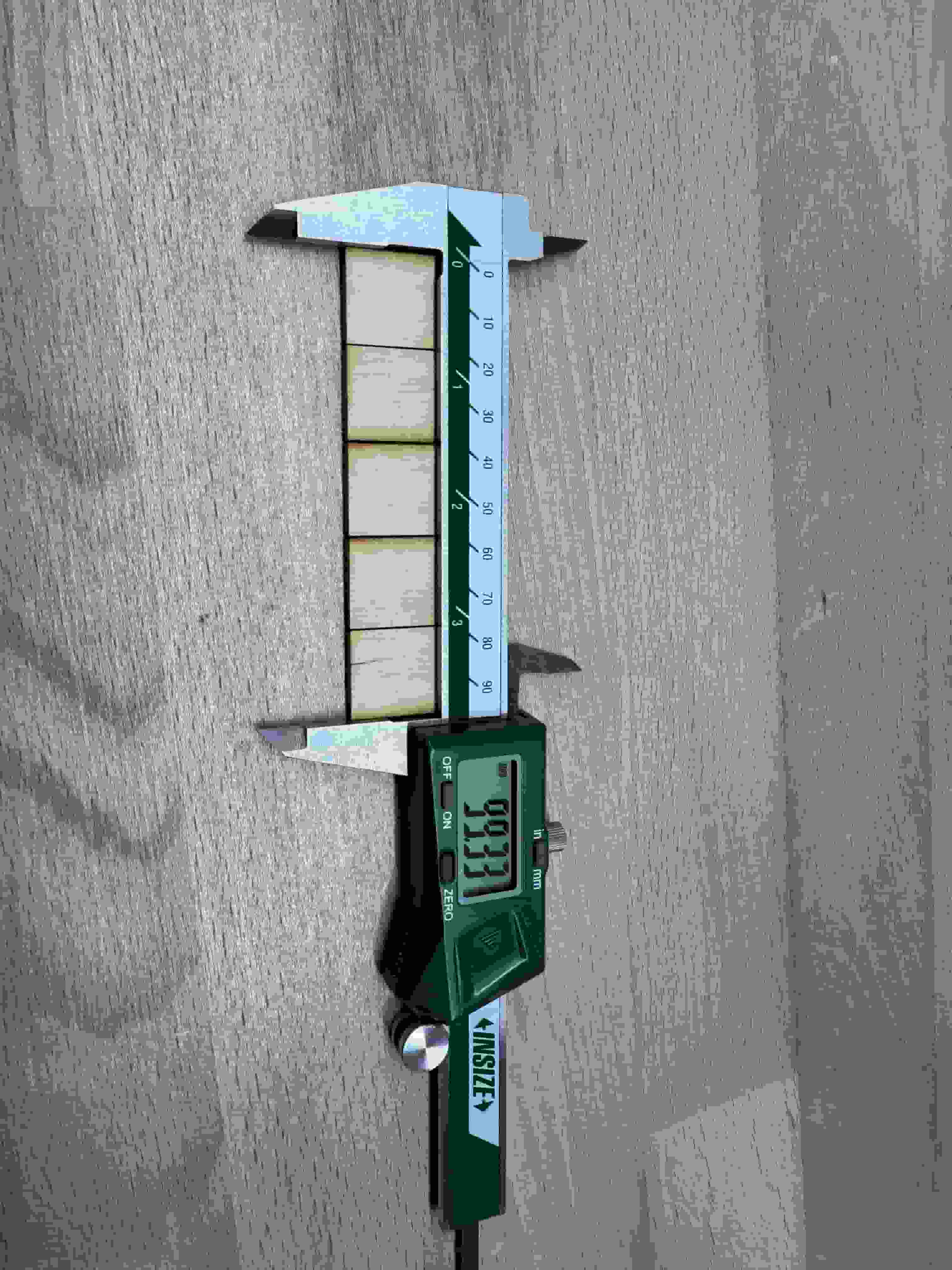 I used a digital caliper to calculated how much material I have left. In an ideal case with 0 kerf, every square piece would be 20mm long and, thus, the total measurement would be 100mm. However, the digital caliper read 99.33mm. So, the total material loss is 0.67mm for 5 pieces of square. This means the kerf is 0.67/5=0.134mm.