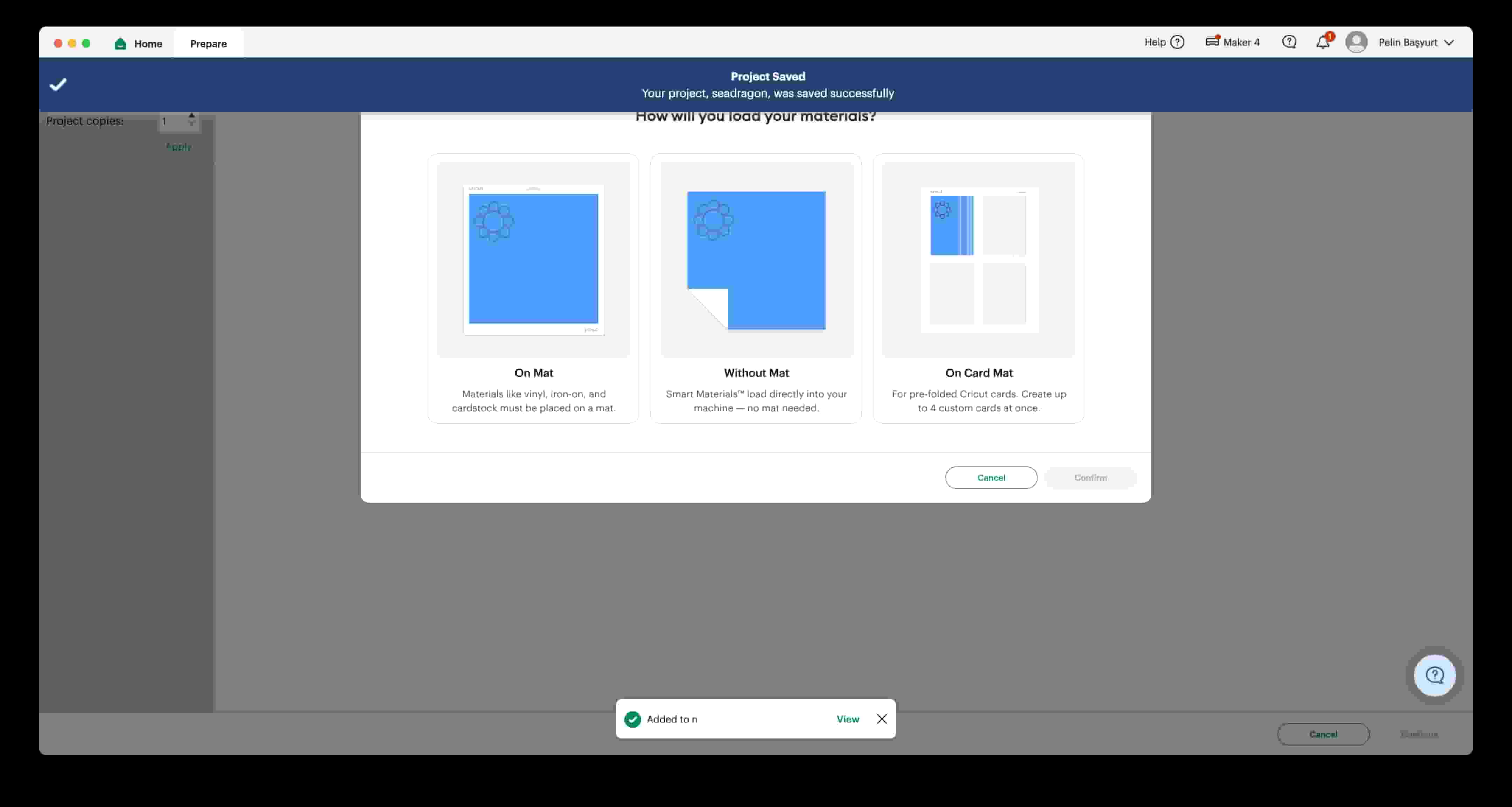 I opened the Cricut Maker 4. Then I went over the the computer and chose the “On Mat” option since I am using a mat.