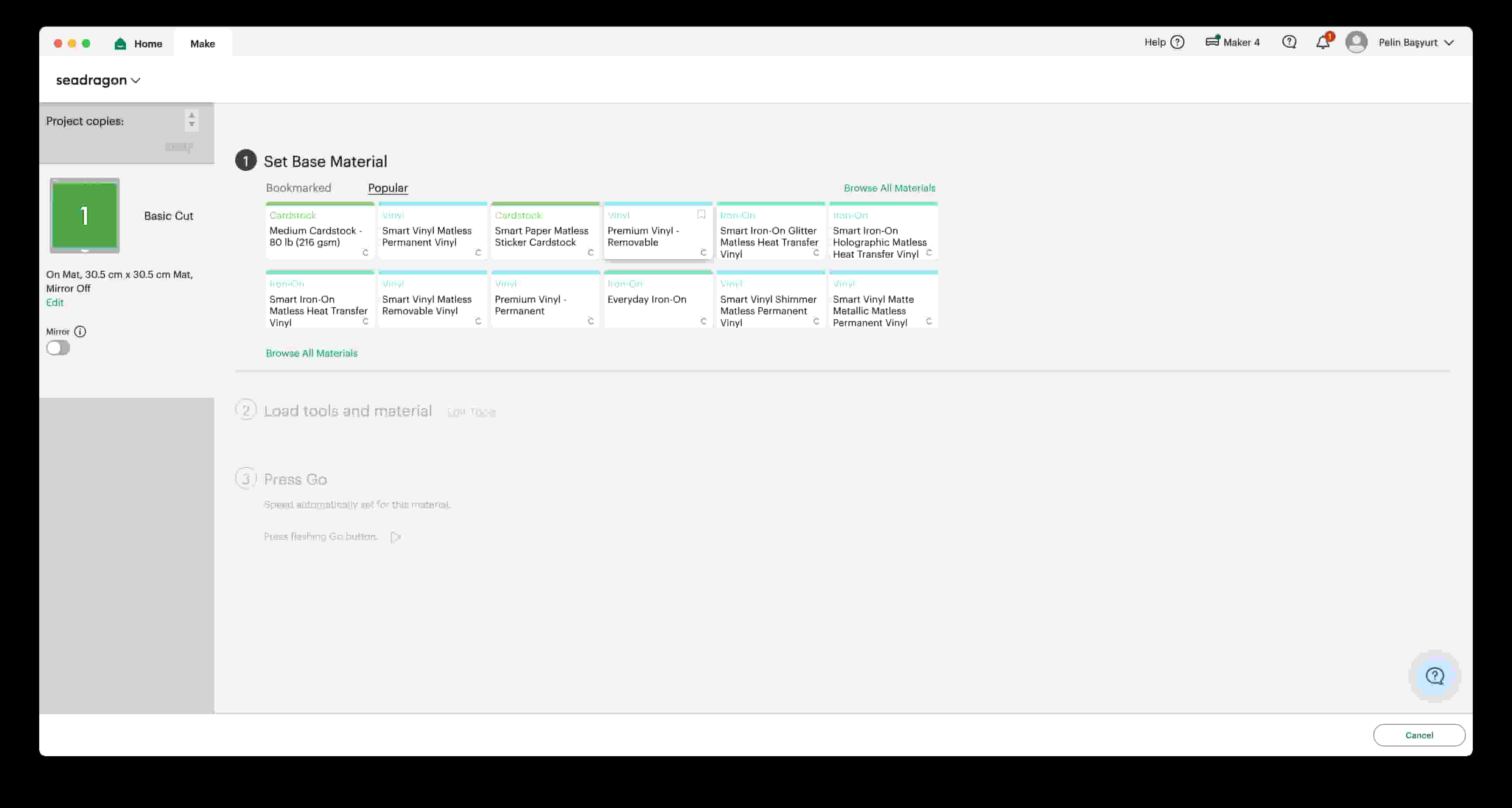 I select the material as Smart Vinyl Matless Permanent Vinyl. Since I chose the “On Mat” option, the material being matless vinyl is not a problem.