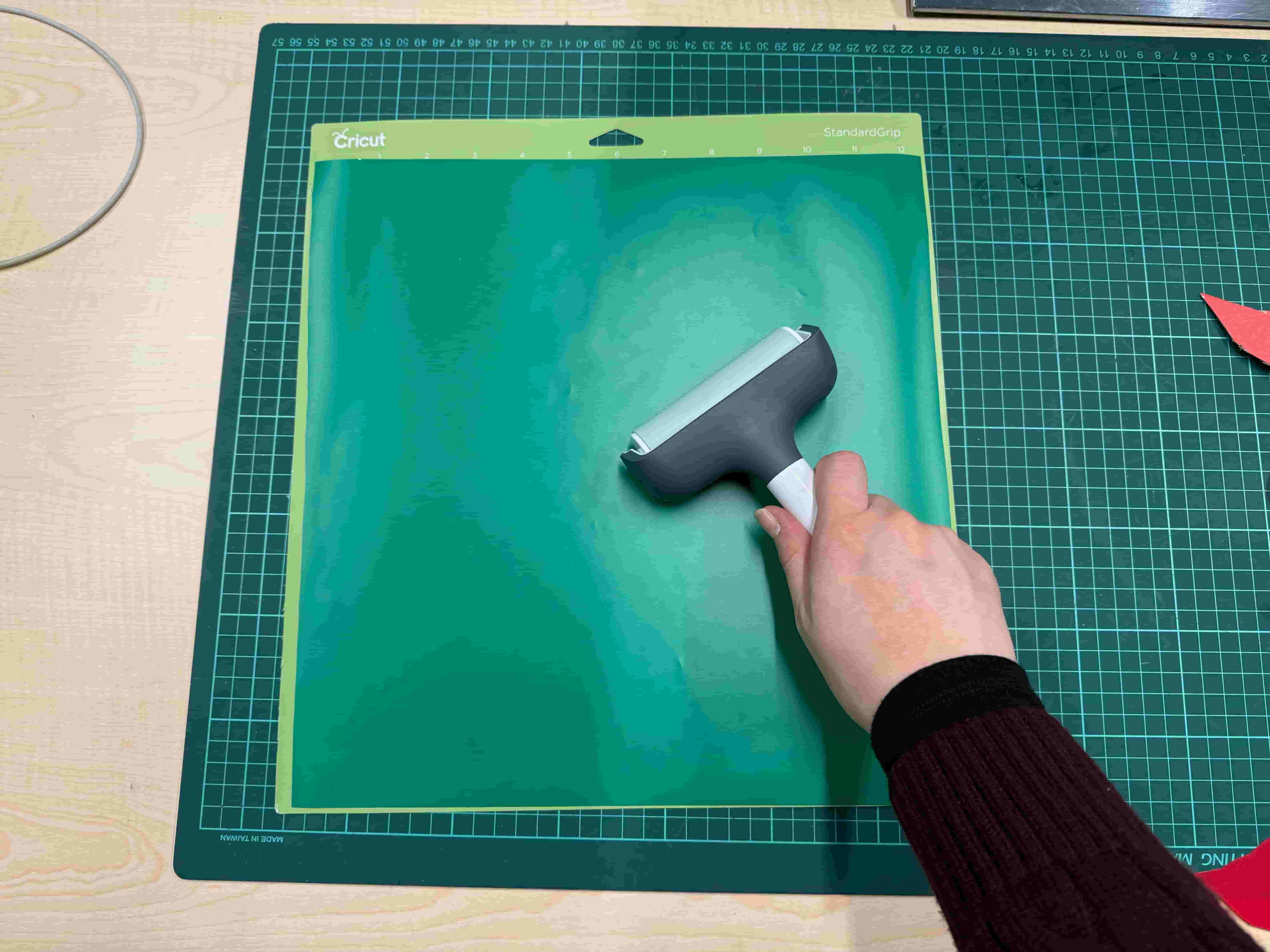 I took the Cricut cutting mat of size 30.5cm x 30.5cm. I chose the green Permanent Smart Vinyl and cut a piece of it. I used a roller to stick it completely without air bubbles onto the mat completely.