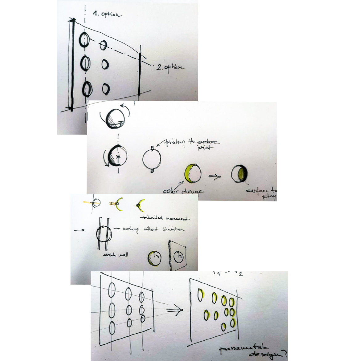 After the first 3D modeling tests, I started sketching to rethink the idea. I was developing a vertical “3 in a row” game inspired by Connect Four, but I wanted to connect it with my final project — an interactive wall.