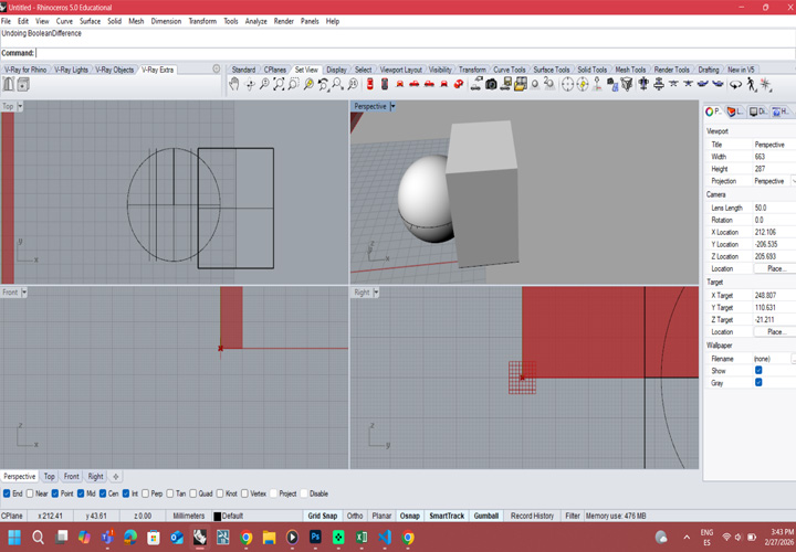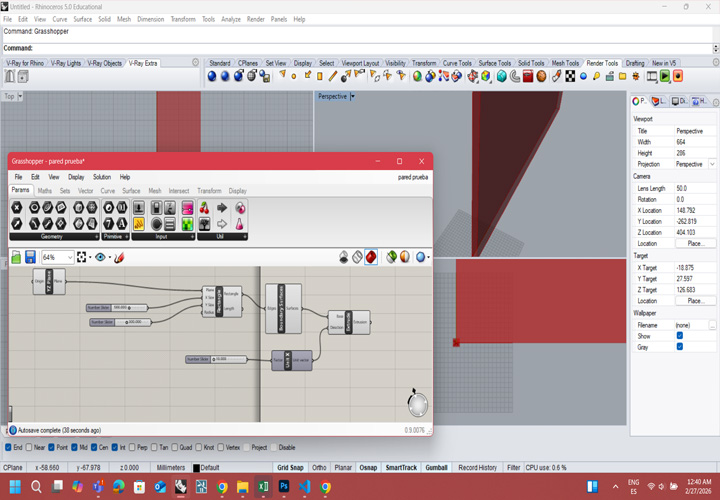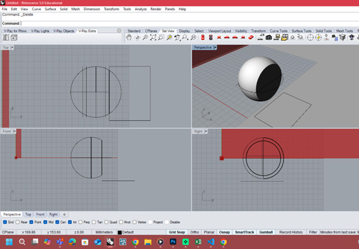 The volume of the cut sphere was modeled in Rhino using the Sphere tool to generate the base geometry and the Boolean Difference command to subtract volumes and obtain the desired form. The wall surface, where the repetition of the spheres will be applied, was start modeling in Grasshopper. Using parametric design will allow us to control the position, spacing, and distribution of the spherical modules efficiently and flexibly for THE FINAL PROJECT.