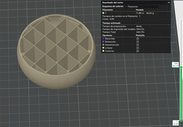 After slicing the model, we reviewed the estimated printing time and material usage. Finally, the file was sent to the 3D printer, and we monitored the process until the print was completed. This workflow allowed us to integrate parametric design and digital fabrication, moving from computational modeling to a physical prototype.