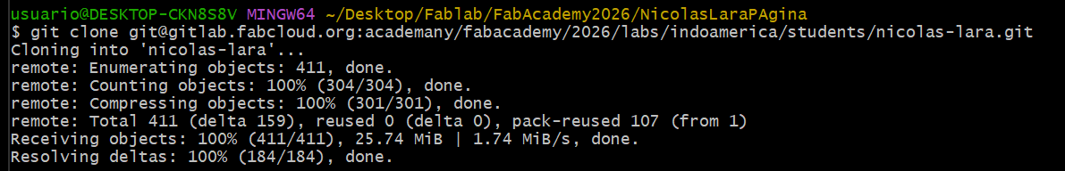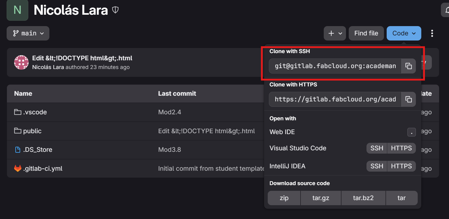 This section documents the complete workflow I followed to connect my computer to GitLab using SSH. Unlike HTTPS authentication, SSH uses a cryptographic key pair — one private key stored locally and one public key registered in GitLab — so every push and pull is authenticated automatically, without entering a password each time. This setup is the foundation for a clean, reliable Git workflow throughout the entire Fab Academy program.