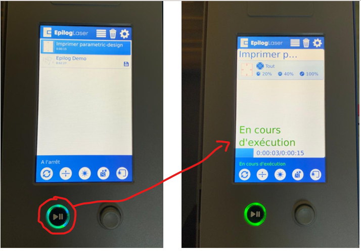 - On the machine’s touchscreen, press the button highlighted in red to start the laser cutting process.