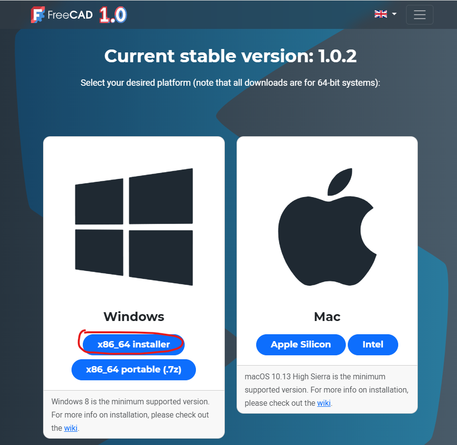 - Go to the following link: https://www.freecad.org/downloads.php?lang=en and click on "86_64 installer".