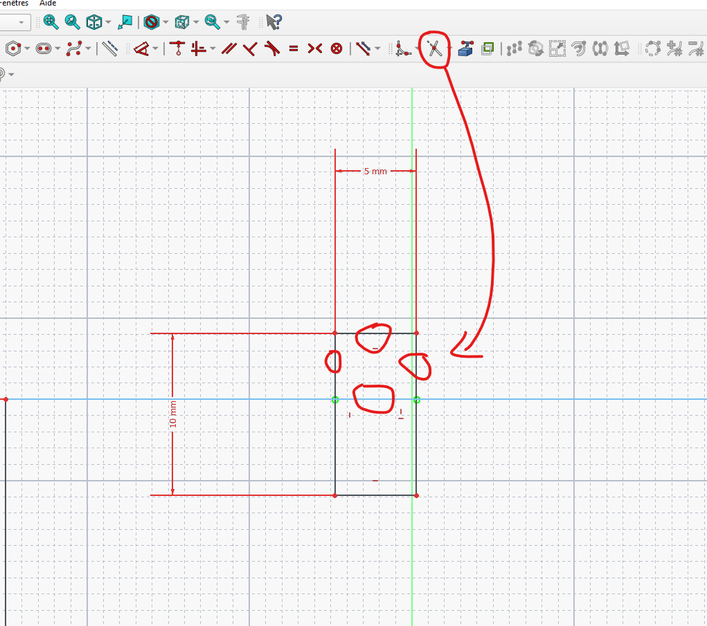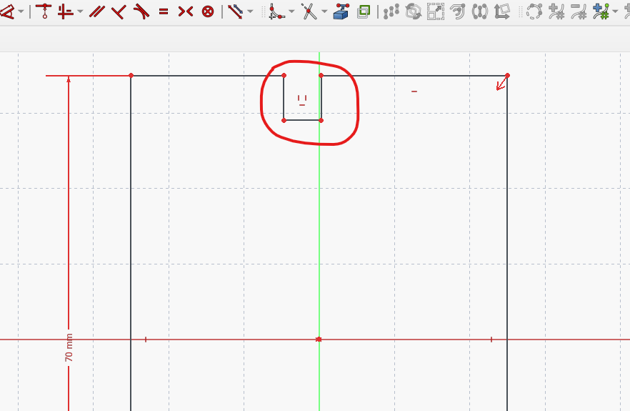 - Click on the “Constrain coincident” tool and apply constraints to the lines highlighted in red until you obtain the result shown below.