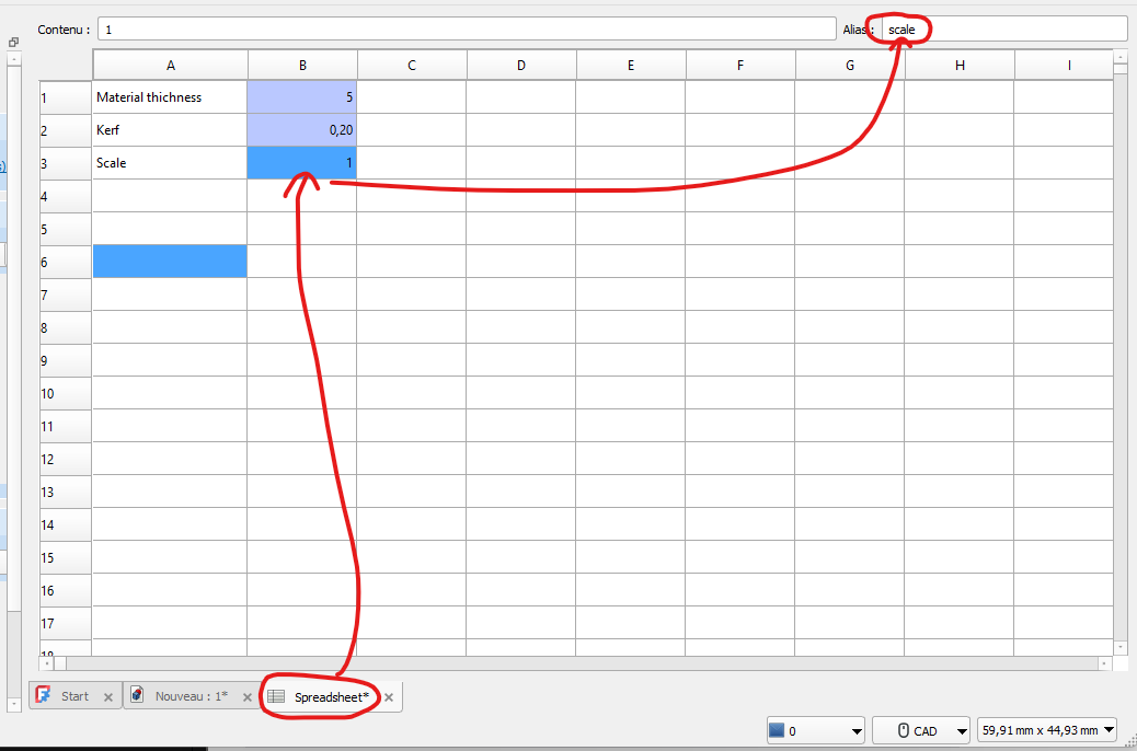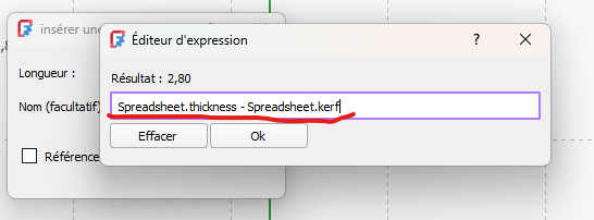- Select the “Dimension” tool and click on the line highlighted in blue. Click the button highlighted in red and enter the expression underlined in red, then click OK.