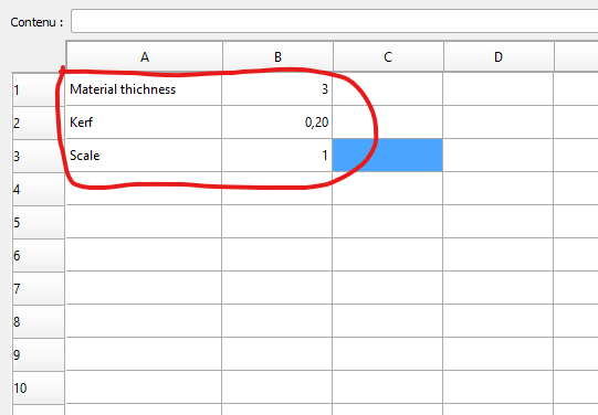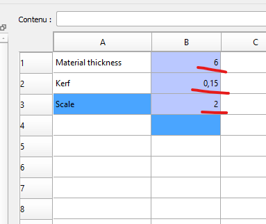 - Enter the parameters and values shown below (material thickness, kerf, slot width, etc.).