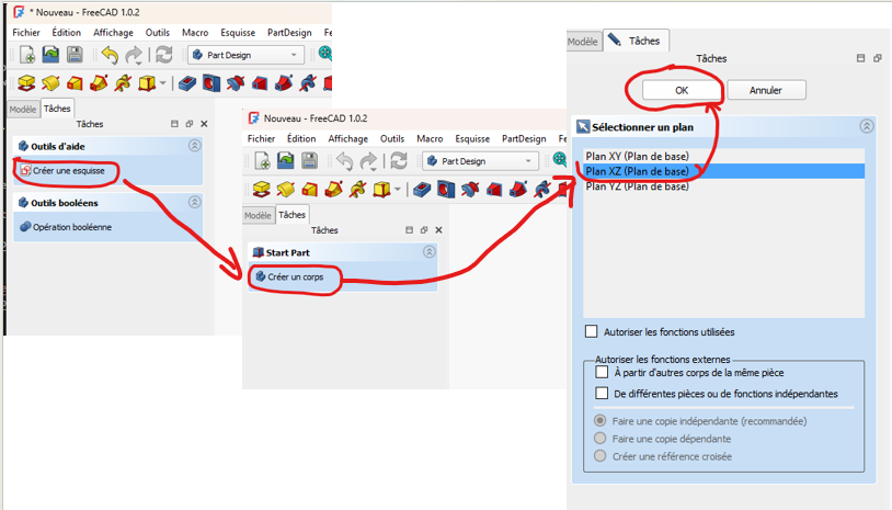 - Switch to the “Part Design” workbench. Click on “Create Body”, then “Create Sketch”. Select the XZ Plane (Base Plane) and click OK.