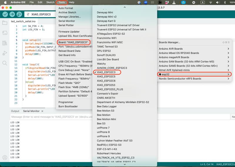 Connect the Xaio ESP32C3 to your PC. Once connected, set up the board and port in the Arduino IDE. Select the Xaio ESP32C3 as the board, and since the ports are different for Windows and Mac, select the port that was added when you connected it. At this time, it is best to set up the USB device only as Xaio ESP32C3, as this will make it easier to configure the port.
