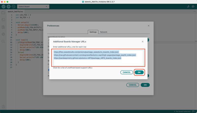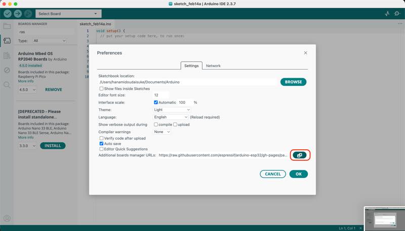After downloading, I launched the app and entered the following URL into the Additional Boards Manager URLs in Preferences, otherwise I would not be able to use either the ESP32 or the RP2040.
