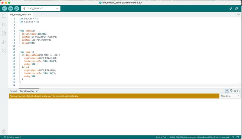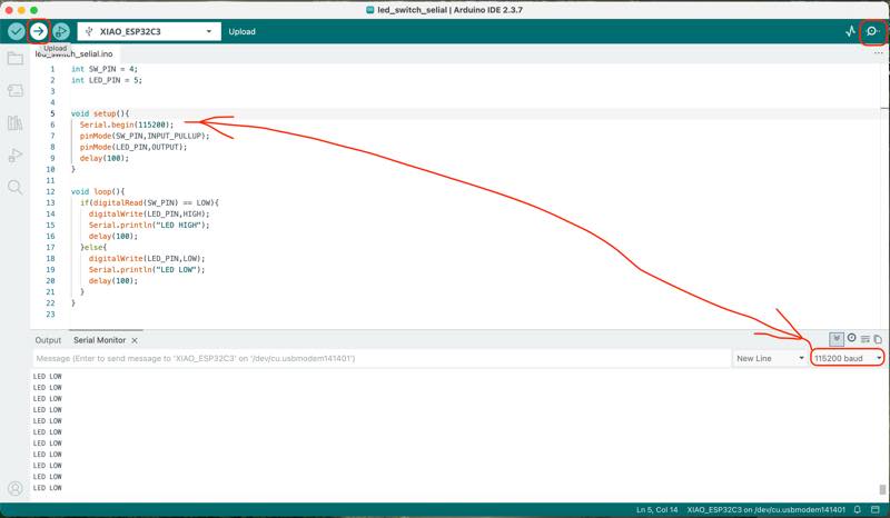 Once you’ve finished writing, press the “upload” button to upload. Once the compilation is complete, writing will begin, but if any errors occur along the way, correct them as they occur. Also, since we’ll be using the serial monitor this time, click the magnifying glass icon in the upper right corner and set the baud rate to match the one set in Serial.begin.