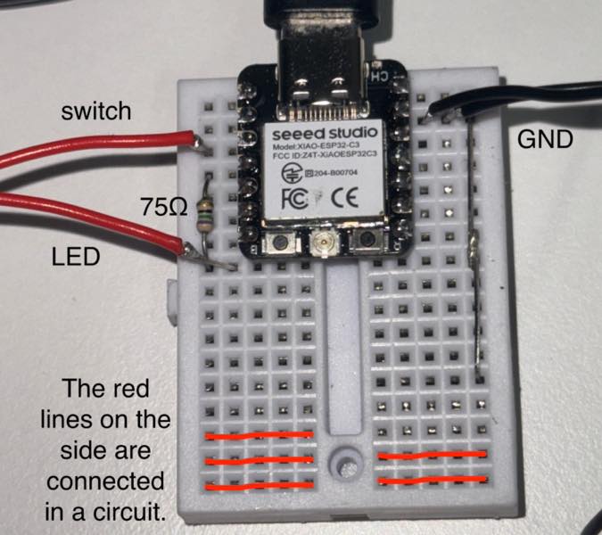Do not connect an LED to a power source by itself. It will glow brightly for a moment and then die. To prevent this, limit the current that flows. The forward current at which an LED performs best is generally said to be around 20mA. Let’s consider a circuit for lighting a red LED rated at 1.8V, 20mA, using a Xiao3.3V. When applying a voltage of 2.1V to the LED, the Xiao outputs 3.3V, so the voltage (3.3V - 1.8V = 1.5V) must be dissipated somewhere. Therefore, a resistor is connected to apply voltage. (A constant current diode can also be used.) Next, use Ohm’s law to calculate the value of the resistor to connect to set the current through the LED to 20mA. The resistance value is 1.5V ÷ 0.02A = 75Ω. (Note: 1A = 1000mA, so 20mA = 0.02A.)