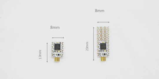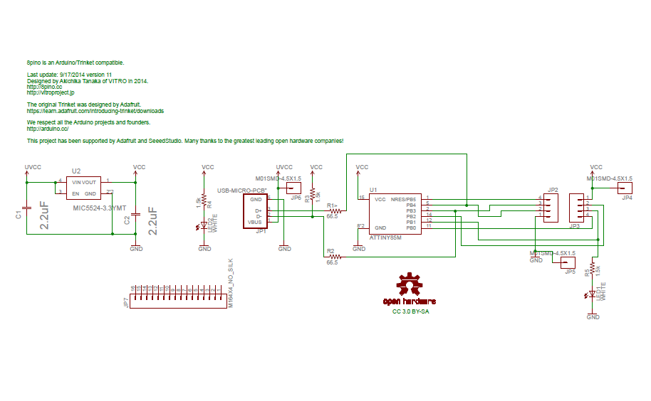 8pino is an Arduino-compatible board (equivalent to Adafruit Trinket) developed by the Japanese creative unit “VITRO” (Ryoji Takahashi/Akira Tanaka). It is used by plugging the board into a USB microB port. It measures 8mm in width and 13mm-23mm in length.