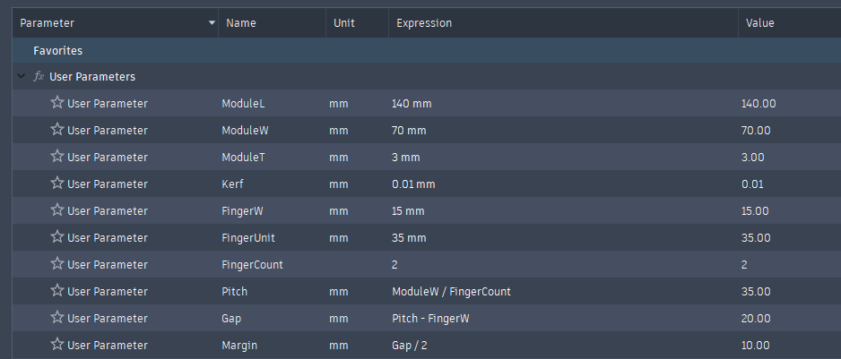 Generating all different sizes of the kit was super easy! All I had to do was open up the parameters window and change two numbers (the length of the part, and a boolean to indicate if hinges should be generated or not).