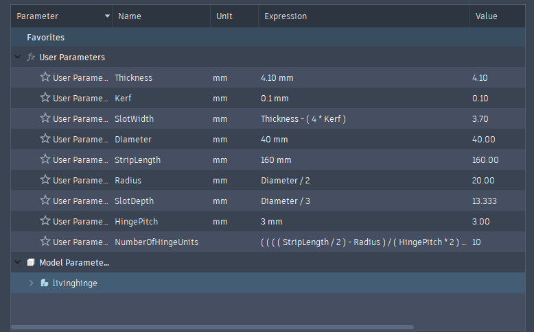 My process for the living hinges required more parameters to be defined. I wanted to be able to create construction "blocks" with differing lengths with and without the hinge applied, so I would need to parametrically define how to generate how many "hinge" units for a given length.