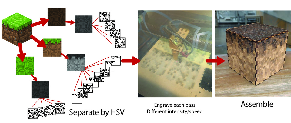 For engraving, I thought of an idea to create a press fit "Minecraft" grass block, where each colour of the original texture would correspond to a different laser wattage and speed, creating a monochromatic (and depth) effect.