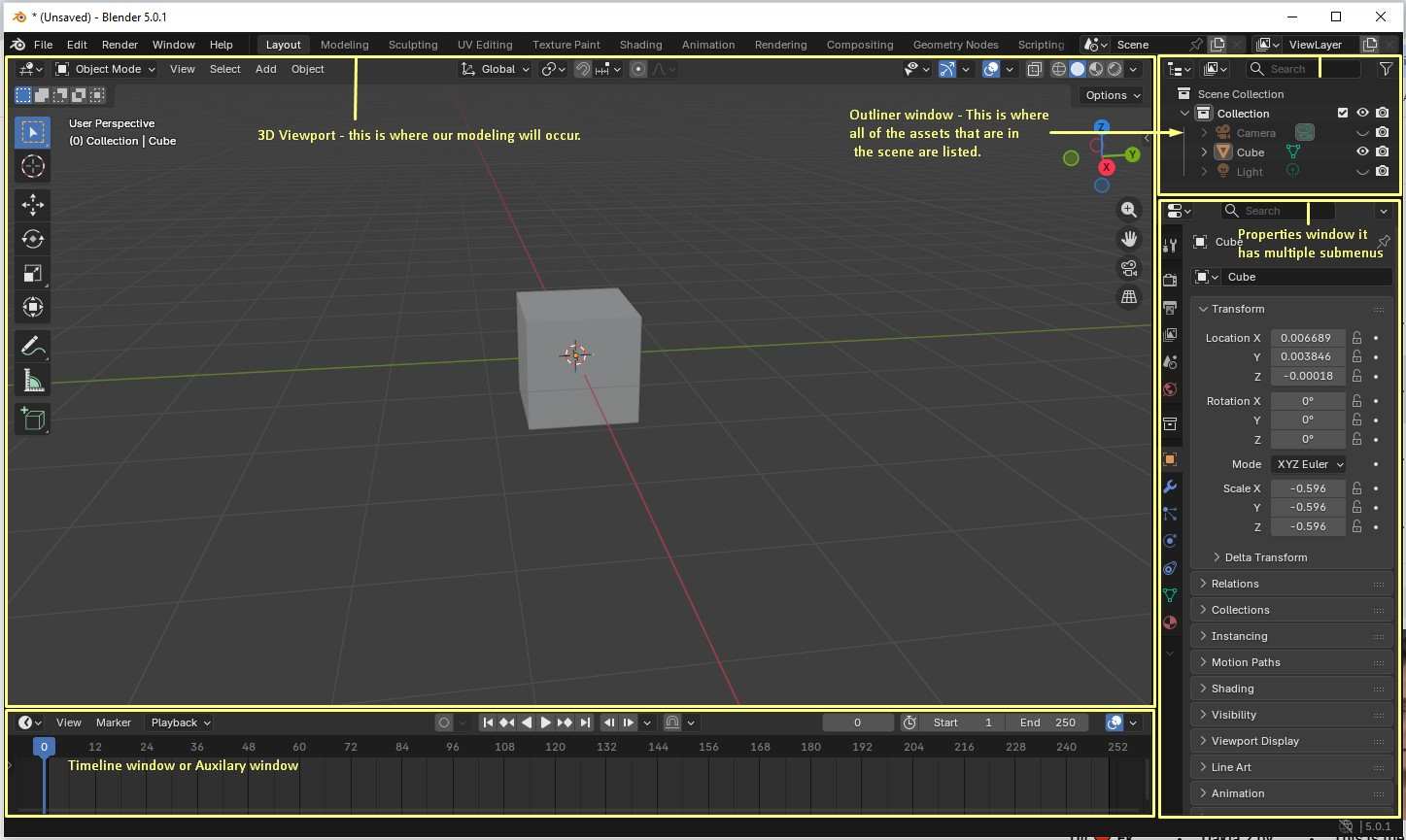 3D Viewport -The main workspace where modeling, transforming, and visualizing objects takes place. Outliner - Displays a hierarchical list of all objects in the scene. By default, a new scene contains Camera, Cube, and Light. Properties Panel - Contains multiple tabs to control object properties, including transforms, materials, modifiers, render settings, and scene options. Timeline - Used for animation control, allowing you to manage frames, keyframes, and playback.