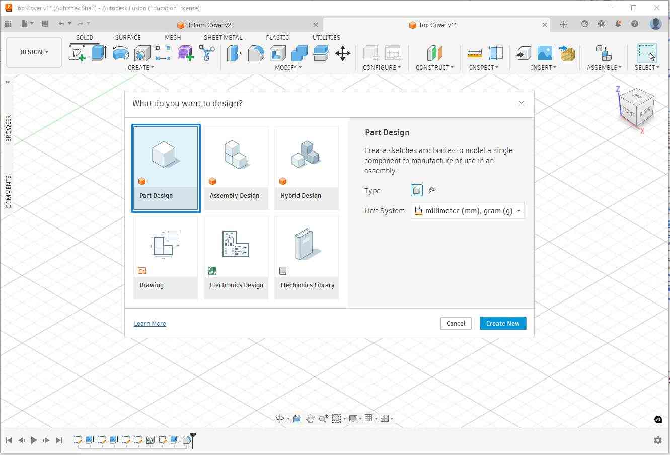 Next, I used the Shell feature to hollow the solid and remove internal material, creating space for electronic components to fit inside the enclosure. I set the wall thickness to 1 mm.
