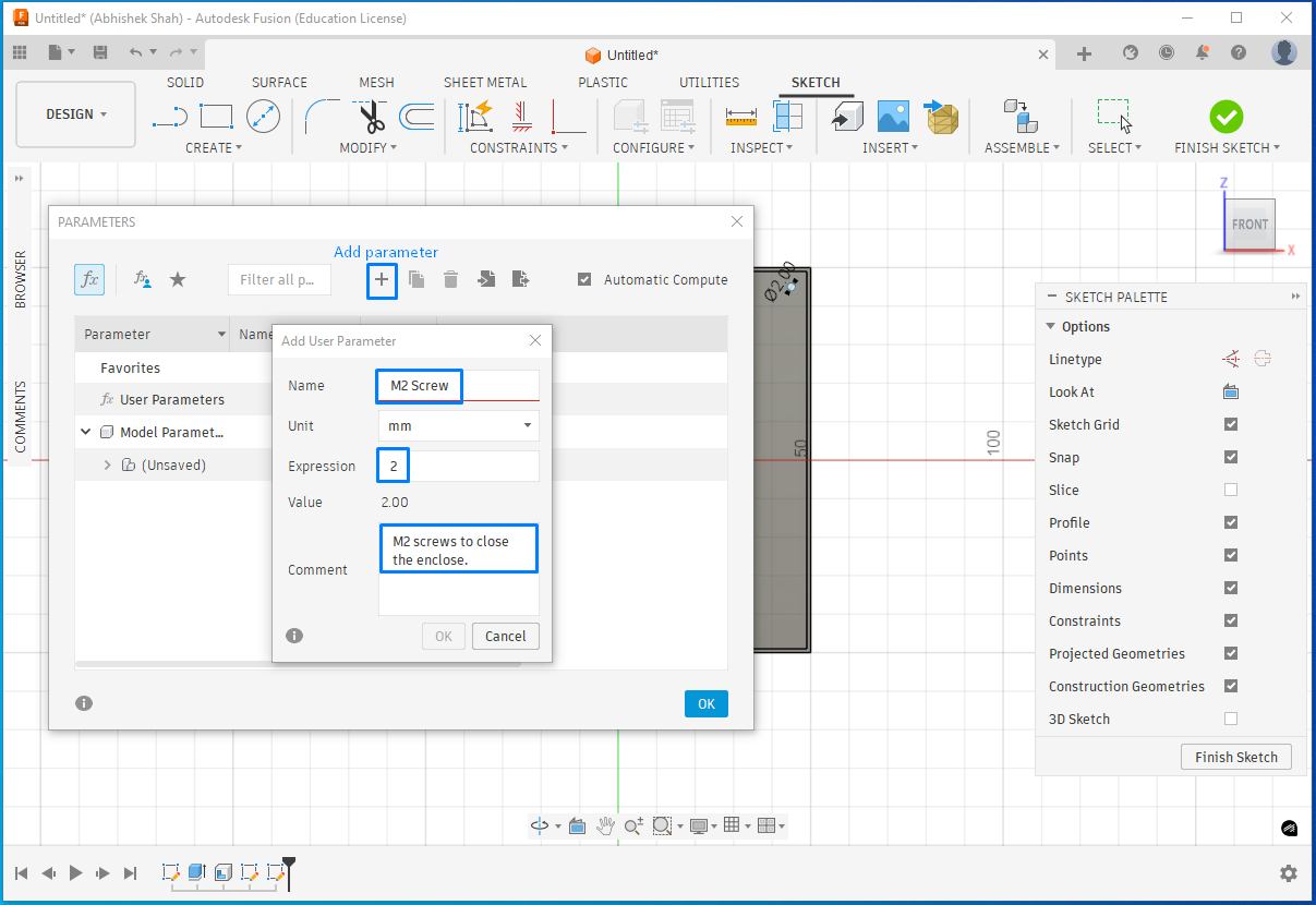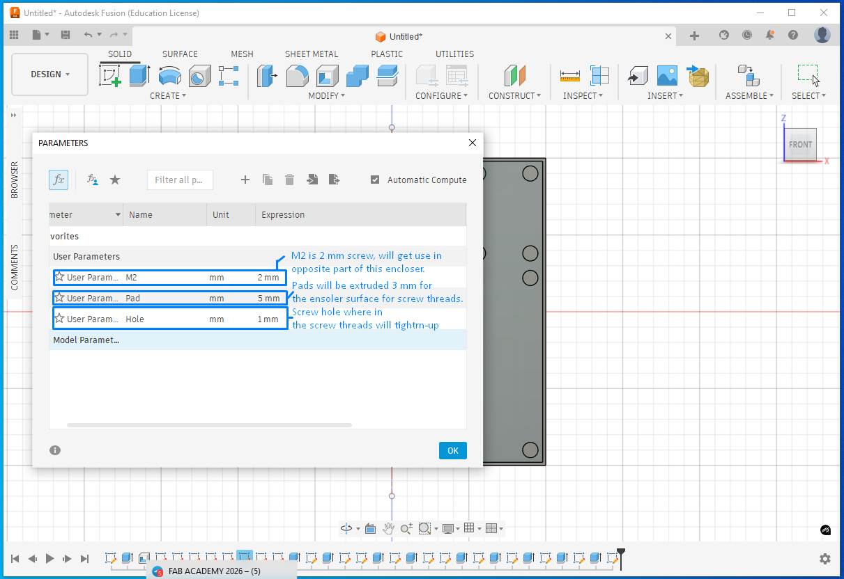 To close the enclosure, I planned to add two screws. I used parametric design so that if the screw size needs to be changed in the future, the update can be done by modifying parameters rather than editing each screw individually.
