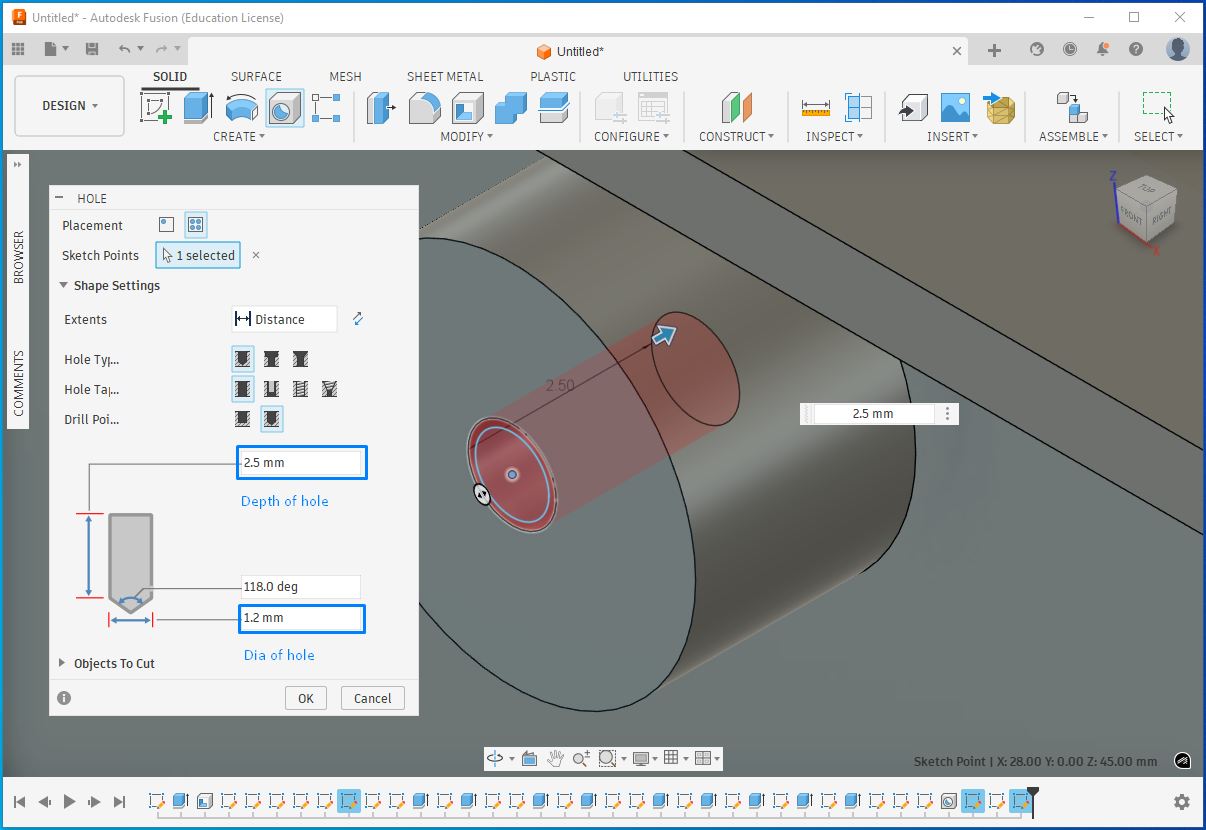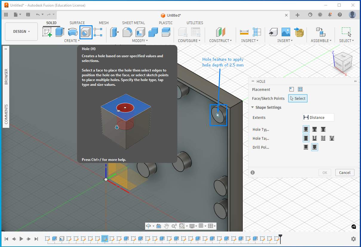 I then added another parameter for the screw hole where the threads would engage. Using the Hole feature, I created holes on the pads by specifying the hole diameter and depth, which removed material accordingly.