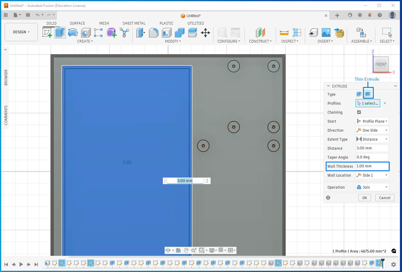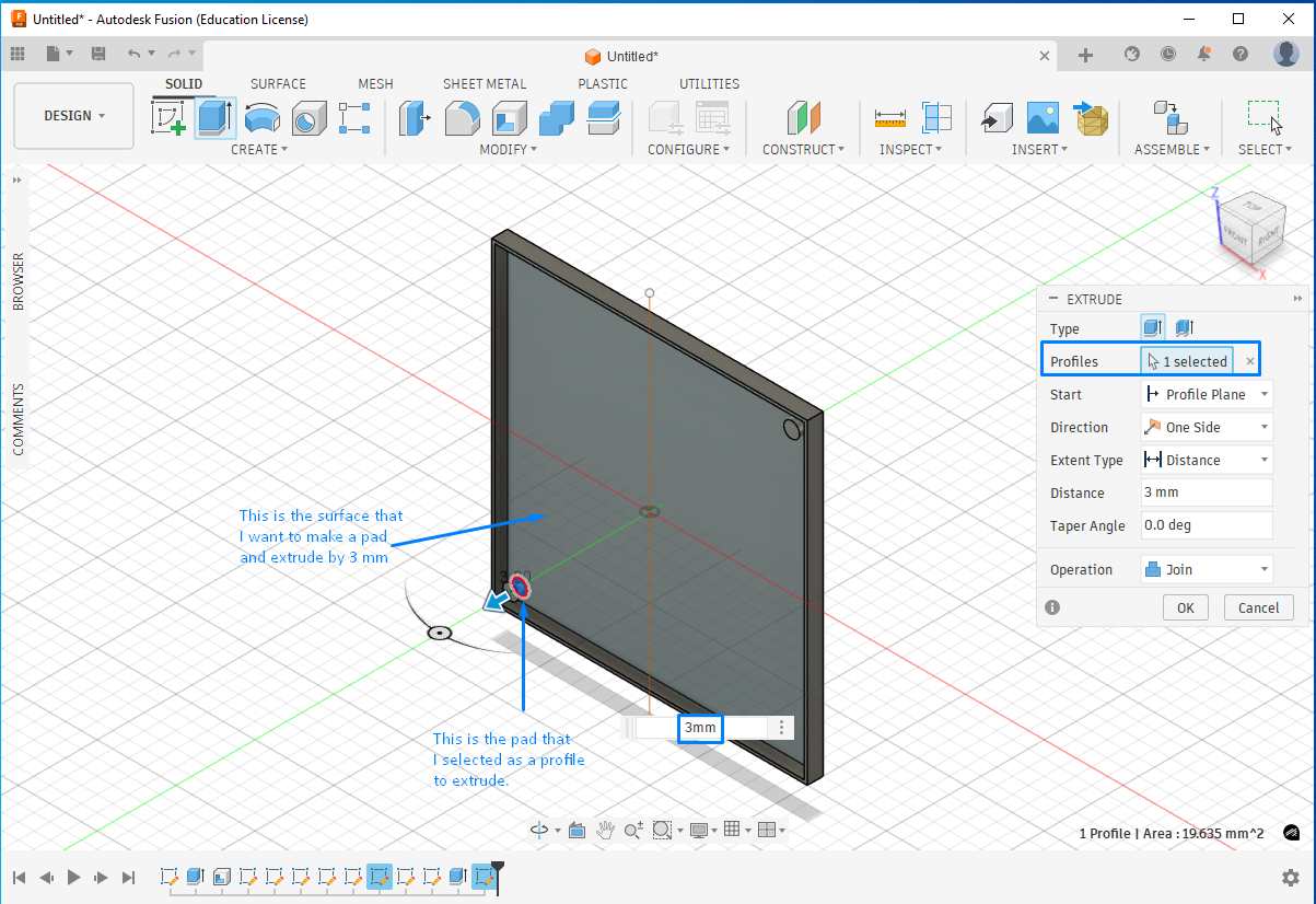 - Select the pad profile and extrude it by 3 mm