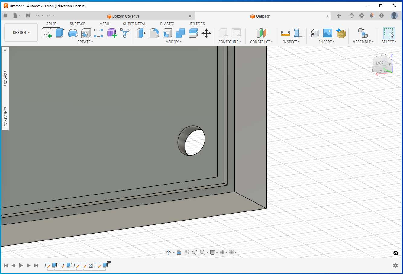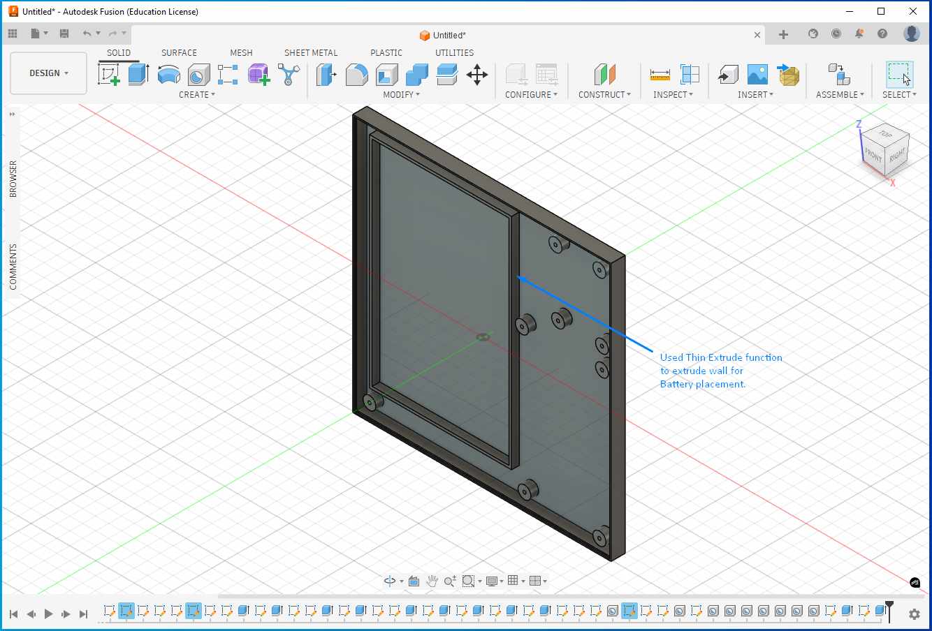 I used the Thin Extrude feature to create a battery placement area, providing a dedicated seating structure for the battery inside the enclosure.