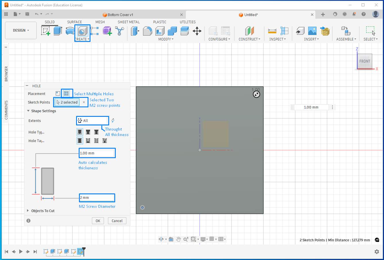 Using Hole feature to perform multiple holes together. Select Multiple Holes option, select all the points where you intend to have a hole, then select All this will through all thickness, it will auto calculate the thickness, enter 2mm for the M2 screw diameter.