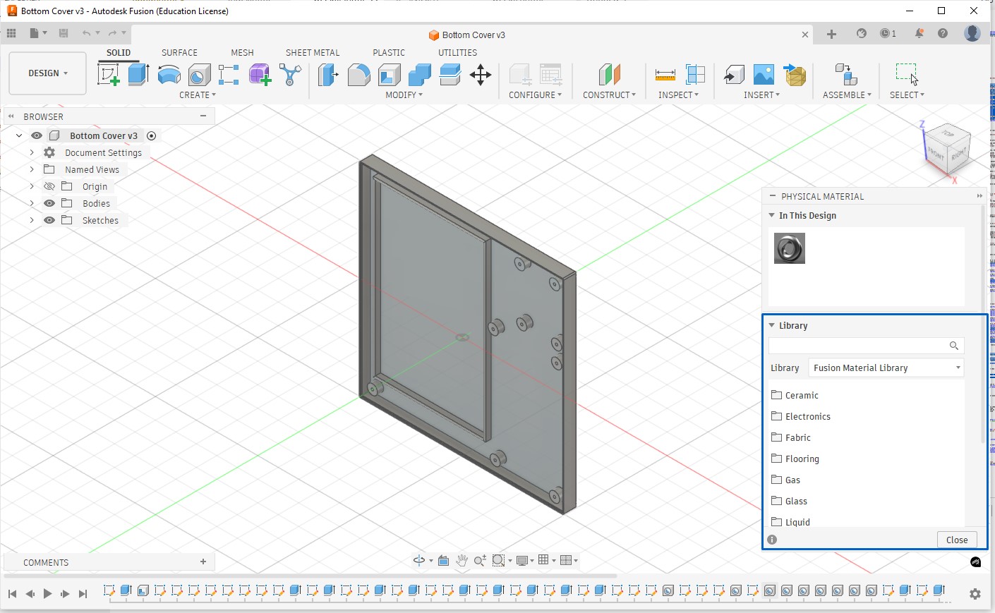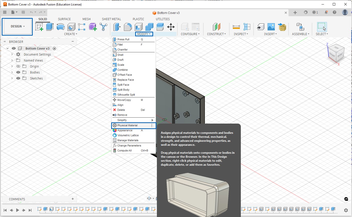 Apply Material Properties (for mass, strength, realism) this affects, weight, density, physical simulation, and realistic appearance (partly). Go to the Design workspace, in the top toolbar, click Modify → Physical Material.