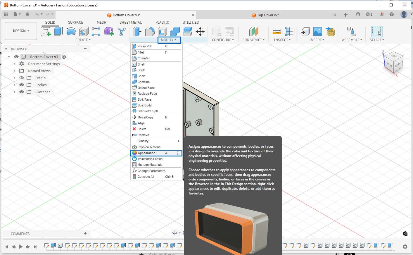 Appearance will control color, texture, surface finish, and render look. Steps to do this are click modify → appearance, appearance library open up, apply appearance browse from categories like paint, plastic, metal, rubber, drag appearance onto part, component, body or face (very useful), for example: black plastic for enclosure, metallic screws, matte finish for PCB housing. Physical Material affects mass & physics, used in simulation, one per body/component whereas Appearance is visual only, used in rendering, can be overridden per face.