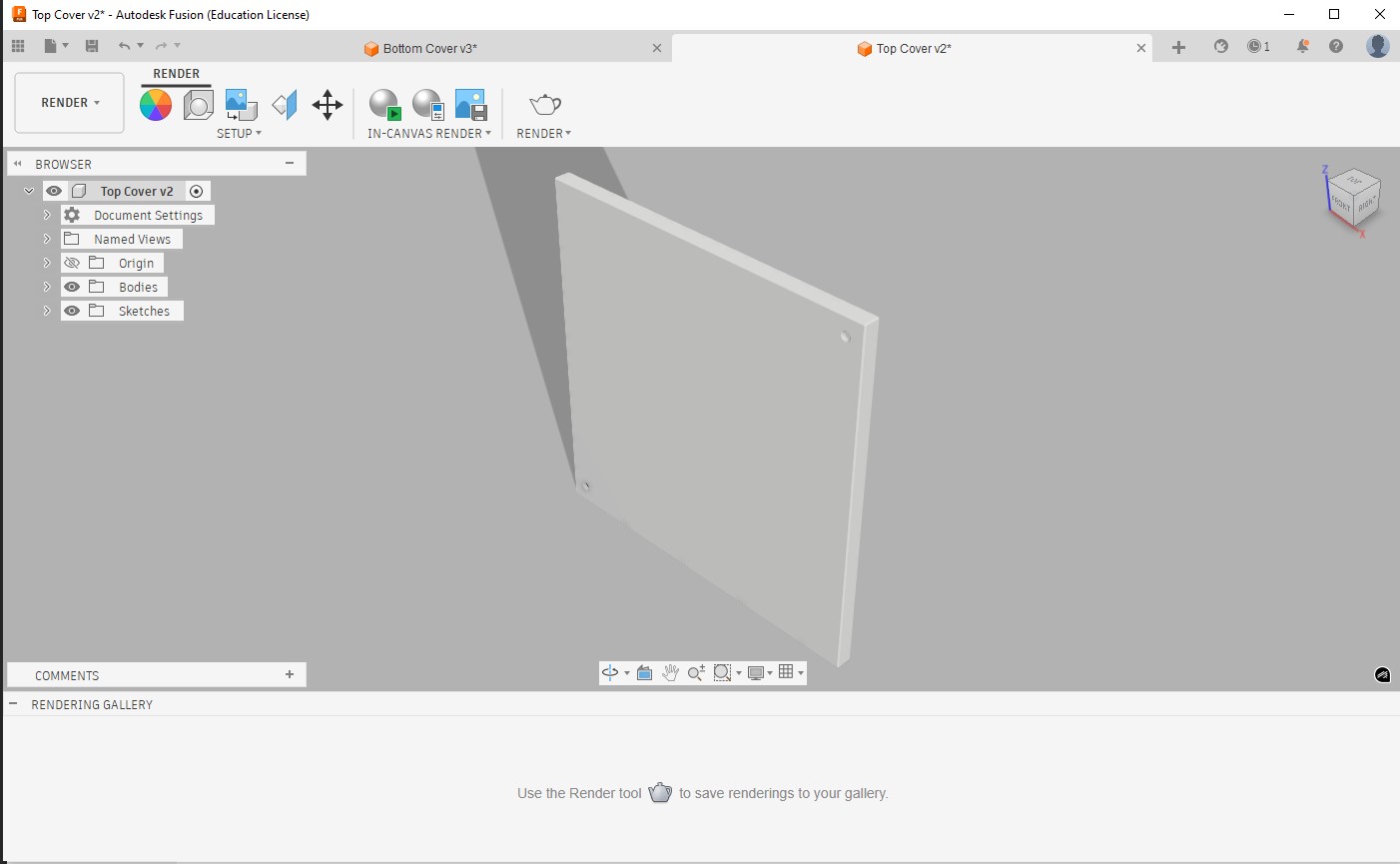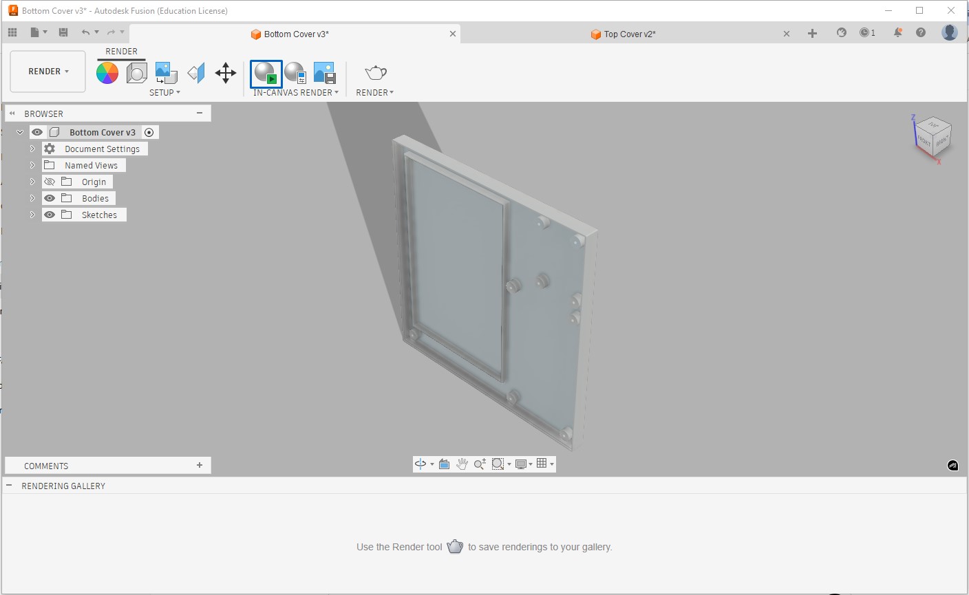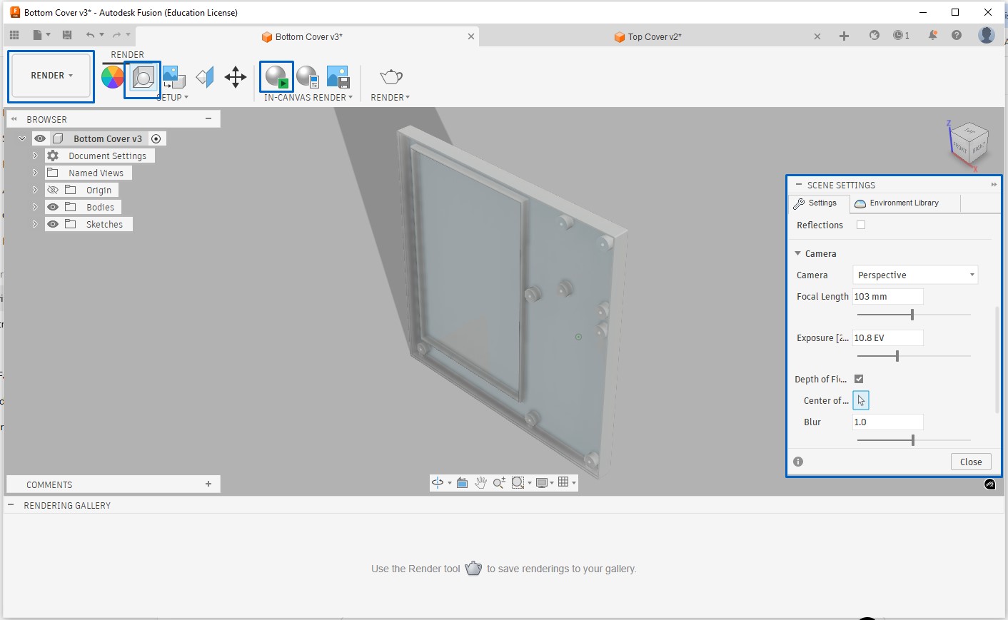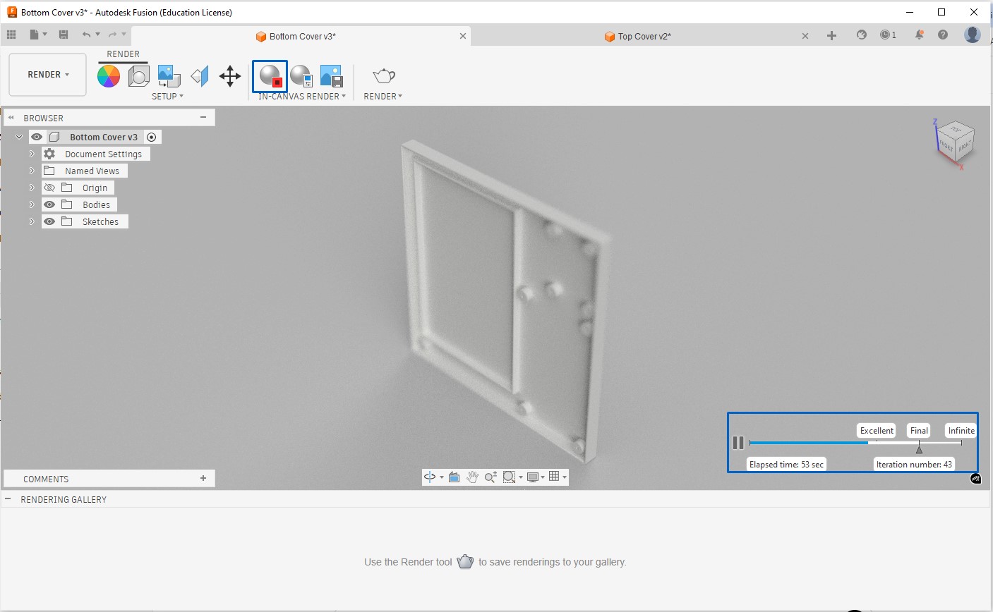 To render the part we need to switch from design to render, under render -> scene settings tab we can adjust lighting, background and shadows. After settings we can start rendering and the part will appear as below, but when rendering process reaches excellent or final level and then we stop rendering process, the part will appear as rendered final part.