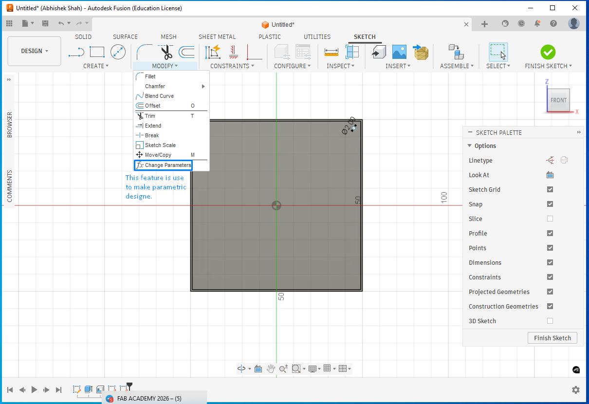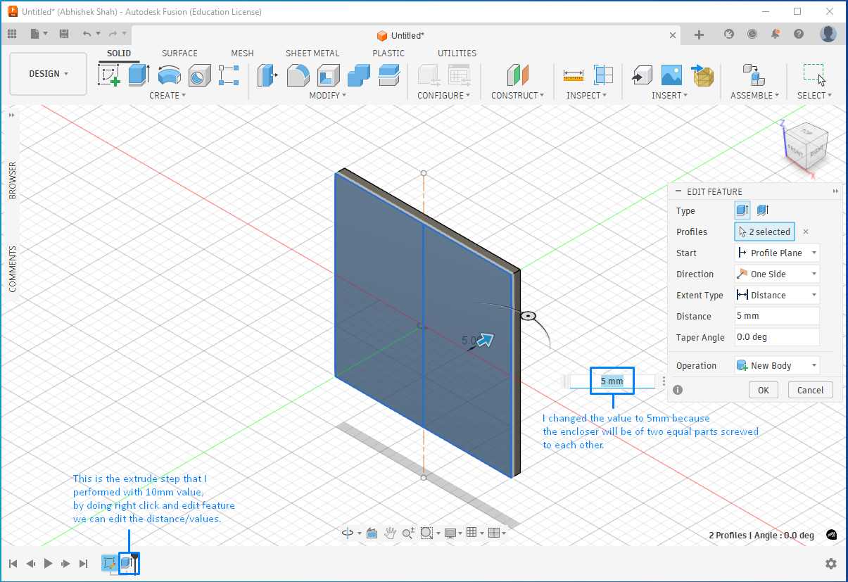 The first step was to select the reference plane on which the part would be designed. I started by creating a sketch and drawing a 100 mm × 100 mm square. After completing the sketch, I switched from the Sketch workspace to the Solid workspace and extruded the square by 5 mm to create the base solid.