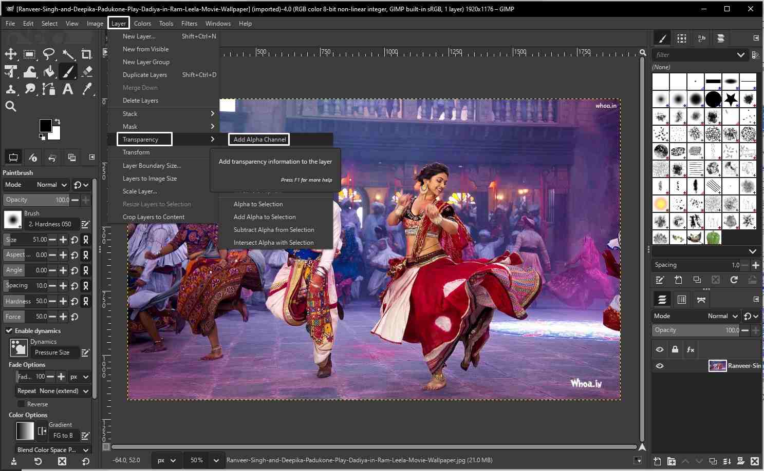 Now lets try some photo editing with GIMP. Below is an image (Image Source) from an Indian movie. As shown in the below screenshot open image in GIMP by File → Open and select image. Add Alpha Channel (very important) Layer → Transparency → Add Alpha Channel. This allows transparent backgrounds.
