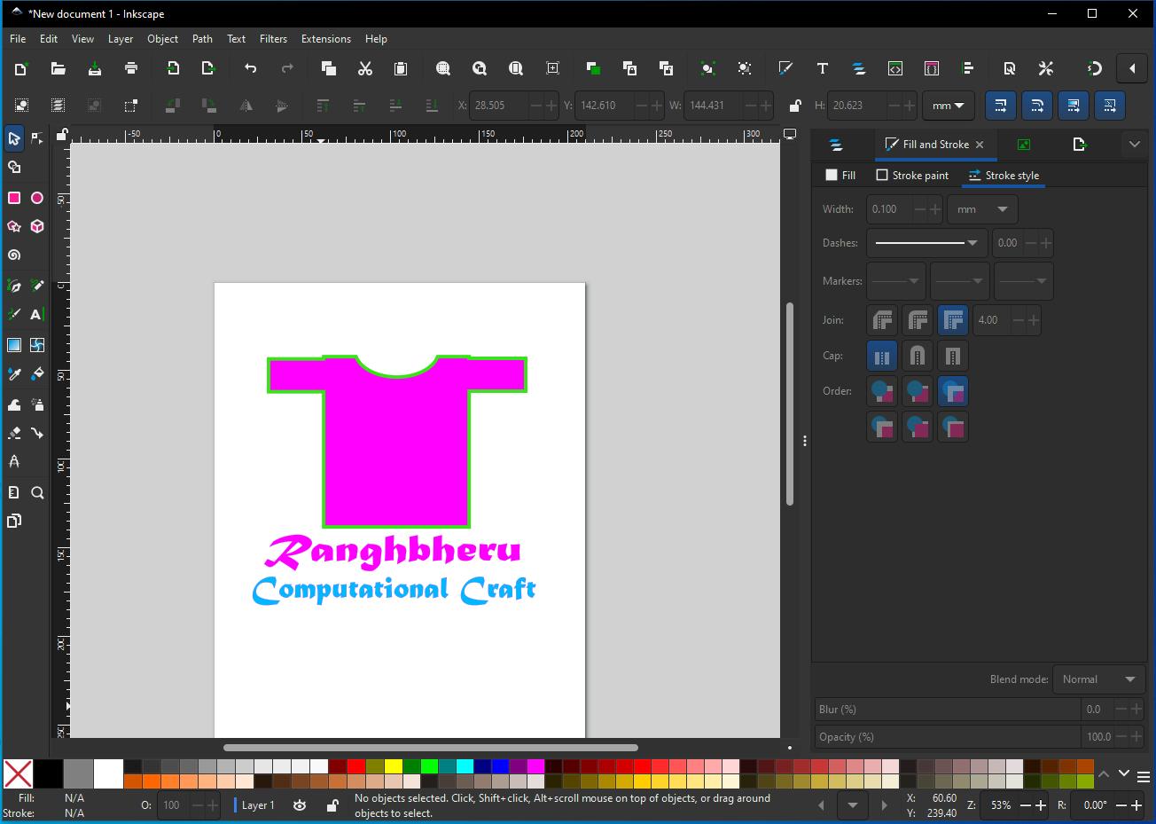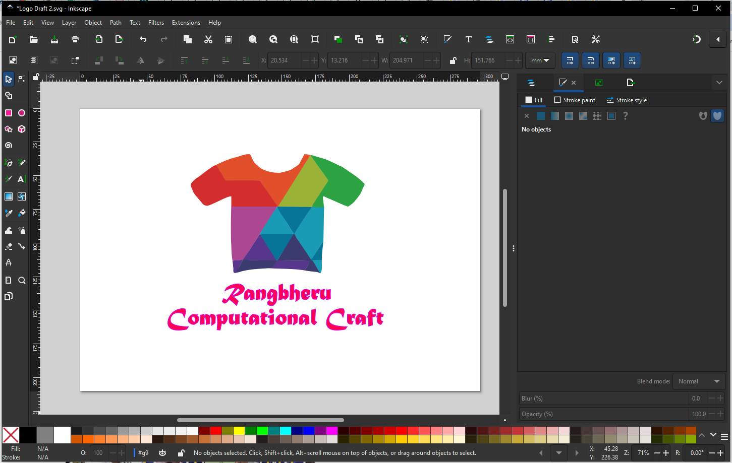 I was not very familiar with Inkscape, so it took some time to understand where the tools were located and how they functioned. I started by creating simple shapes and experimenting with the shape tools. As part of this exploration, I decided to design a logo for my computational wearable textile project.