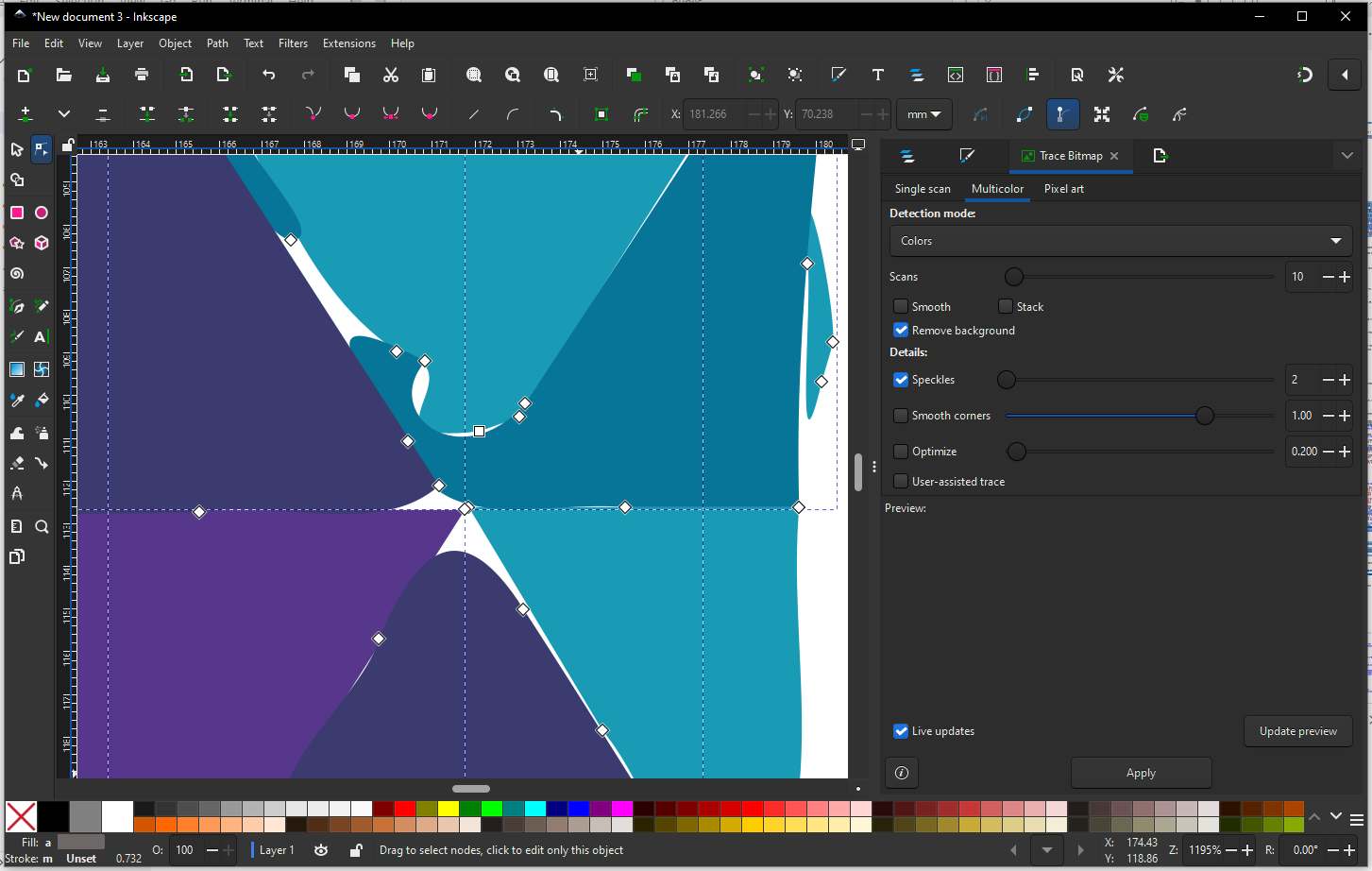 The Node Tool lets us Edit individual nodes (points) on a path, it let us adjust segments between nodes and lets us clean messy vector edges without changing shape intent. Select the traced vector and make sure it’s un-grouped (Object → Ungroup), press N to apply node tool, we will see nodes - small squares and path segment connecting them- now we can select nodes and adjust them, delete them to clean up the Logo.