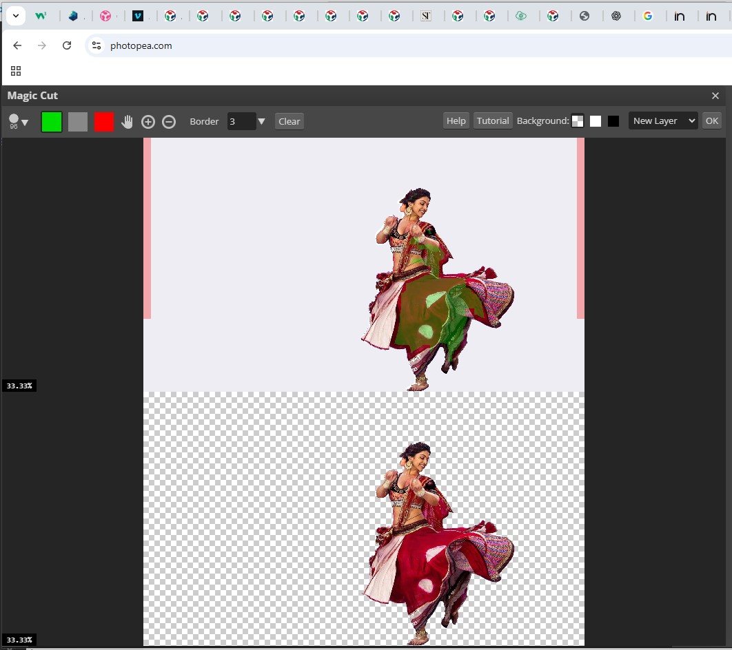 Using Photopea, I tried to remove background → keep subject → transparent background (no background) → paste over another image. First I open Photopea then opened the image that I want to make No-background, now to unlock the background layer, I double-clicked on background and click OK - this converts it to a normal layer and enables transparency. Now I used Magic Cut tool (under select tab) then paint over the subject you want to keep, and clicked OK - Background is removed automatically. we should see a grey checkerboard pattern, this means the background is gone.