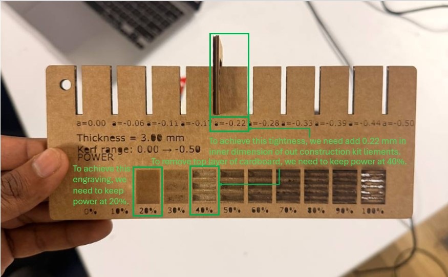 As part of our group assignment, we received safety training on operating the laser cutting machine. We also conducted kerf tests on different materials to determine precise values for achieving tight and reliable press-fit joints.