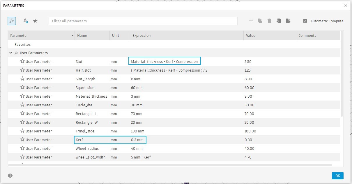 Based on the data collected during the group assignment, I began designing my own press-fit construction kit in Autodesk Fusion 360. I first defined the kerf and material compression values obtained from testing 3 mm cardboard as parametric variables.