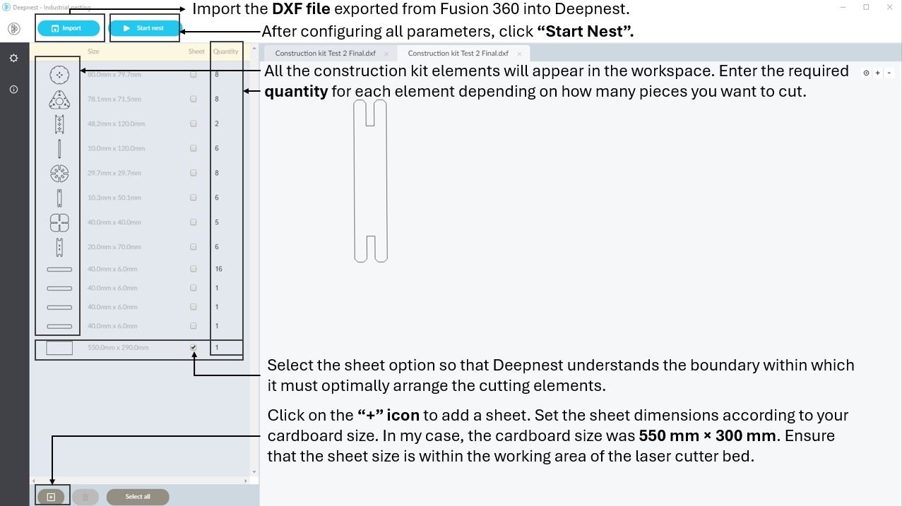 Import the DXF file exported from Fusion 360 into Deepnest. All the construction kit elements will appear in the workspace. Enter the required quantity for each element depending on how many pieces you want to cut. Click on the “+” icon to add a sheet. Set the sheet dimensions according to your cardboard size. In my case, the cardboard size was 550 mm × 300 mm. Ensure that the sheet size is within the working area of the laser cutter bed. Select the sheet option so that Deepnest understands the boundary within which it must optimally arrange the cutting elements. After configuring all parameters, click “Start Nest” to automatically optimize the layout and minimize material waste.