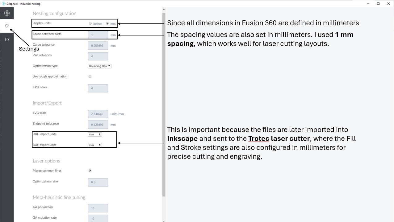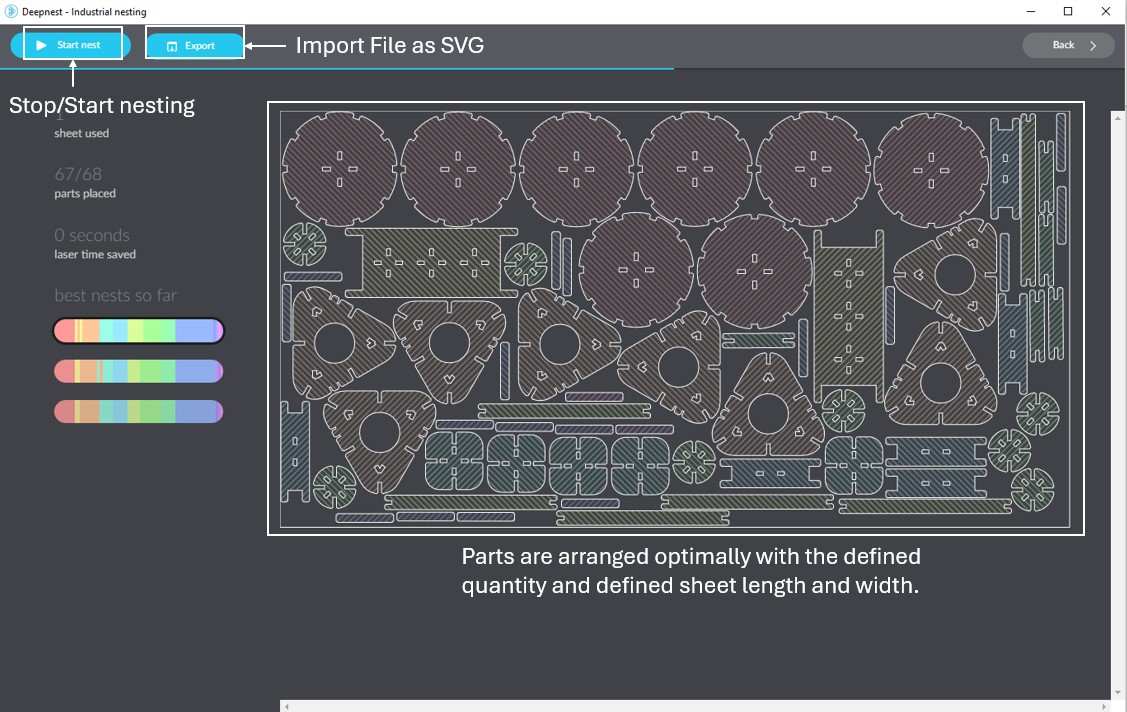 Once the parts are arranged optimally, stop the nesting process and click Import, then save the layout as an SVG file. This SVG can now be opened in Inkscape to verify and adjust the Fill and Stroke settings for laser cutting.