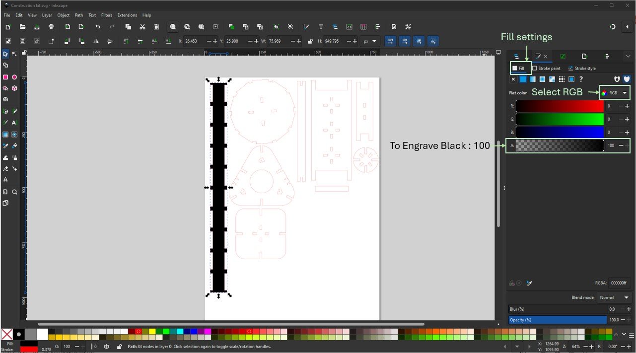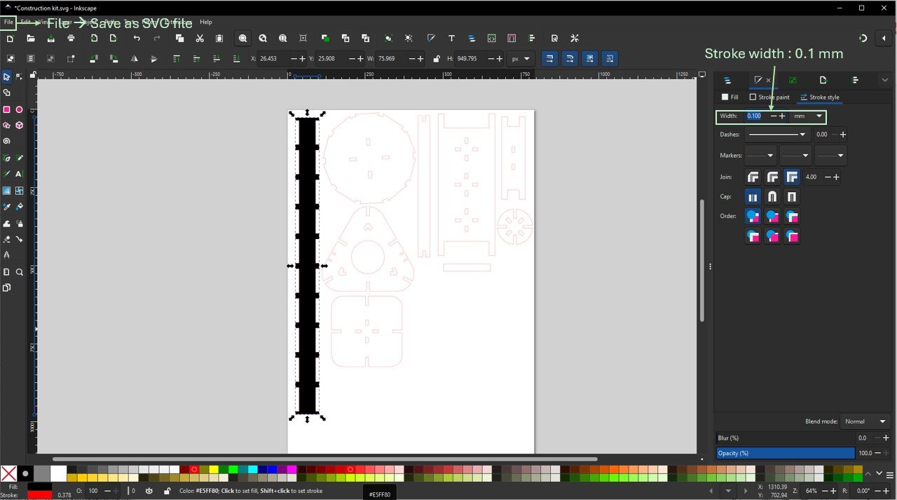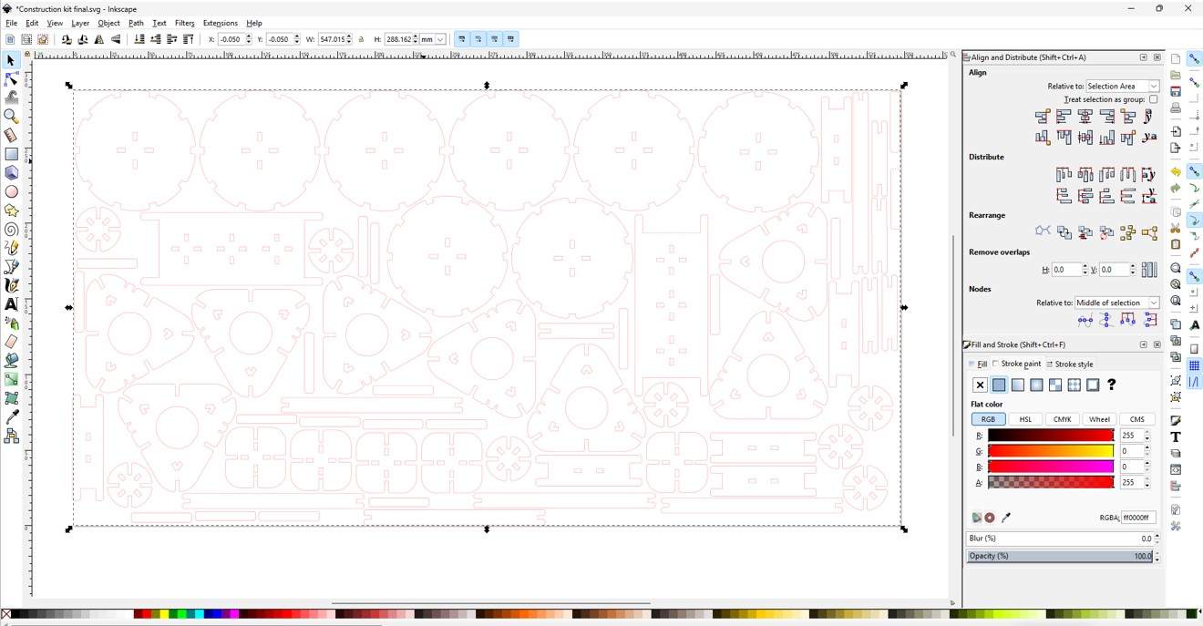 Next, I opened the DXF file in Inkscape, ungrouped the elements, and rearranged them to optimize material usage. After repositioning, I regrouped the design and set the stroke width to 0.1 mm. For engraving, I applied a black fill, and for cutting, I set the stroke color to red, as shown in the images below. Finally, I saved the file as an SVG for laser cutting.