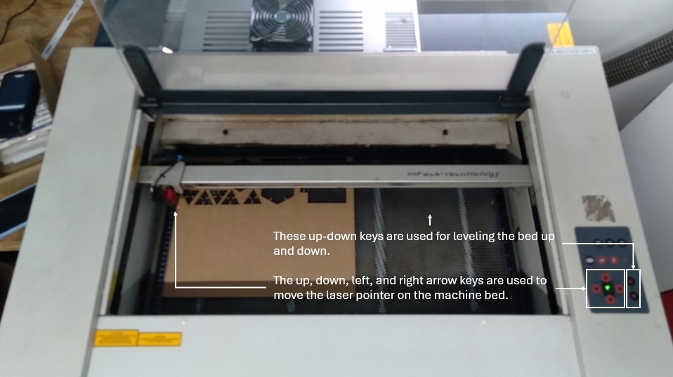 The up, down, left, and right arrow keys are used to move the laser pointer on the machine bed. As the pointer moves, the reference position in the Trotec Job Control software also updates accordingly. This helps in precisely setting the starting point of the cut on the cardboard sheet.