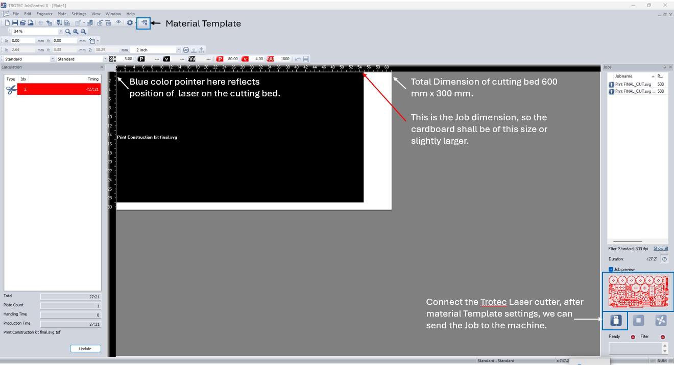 Once everything was verified, I pressed Ctrl + P to print. The Trotec laser cutter appeared in the printer list, which automatically opened the Trotec JobControl software to begin the cutting process.